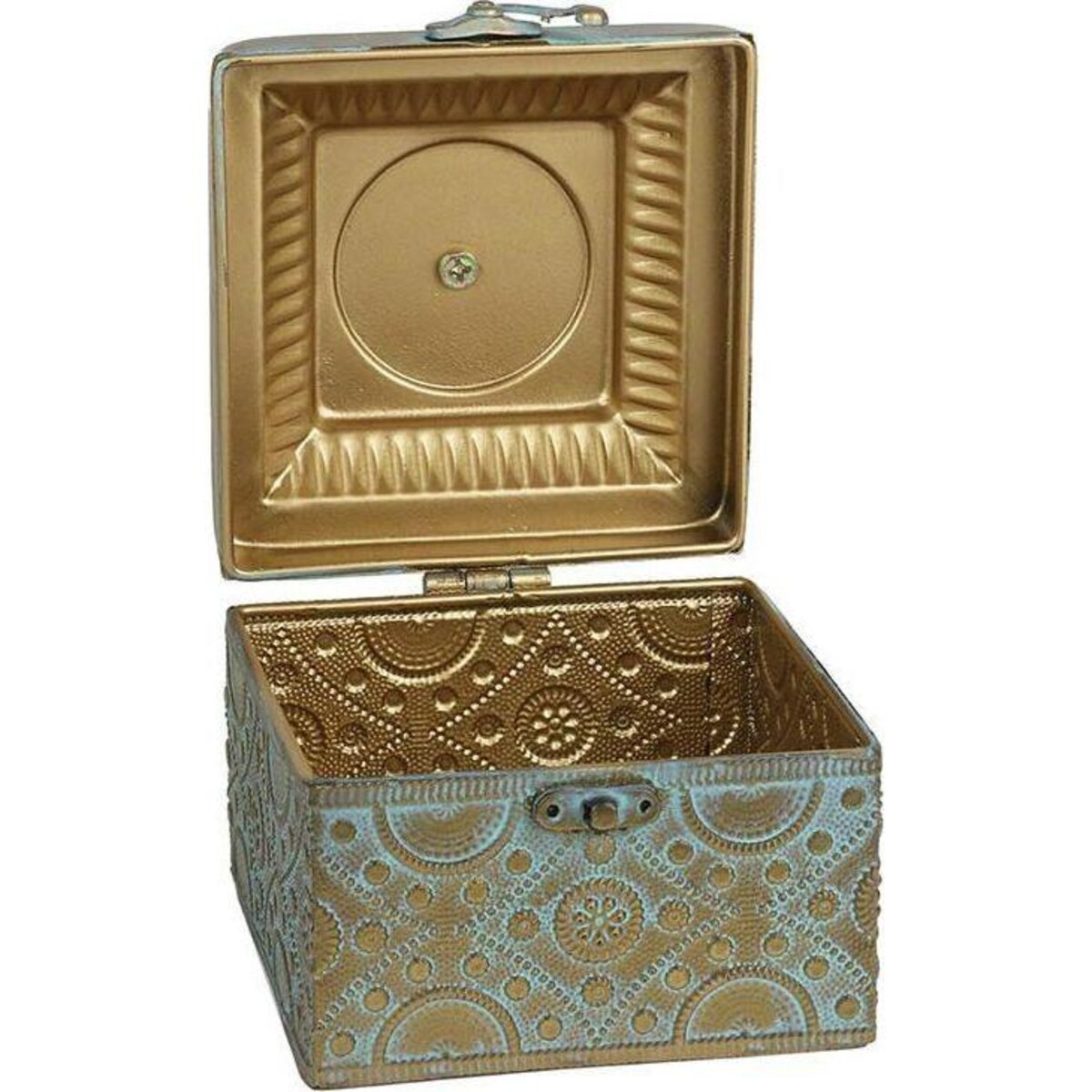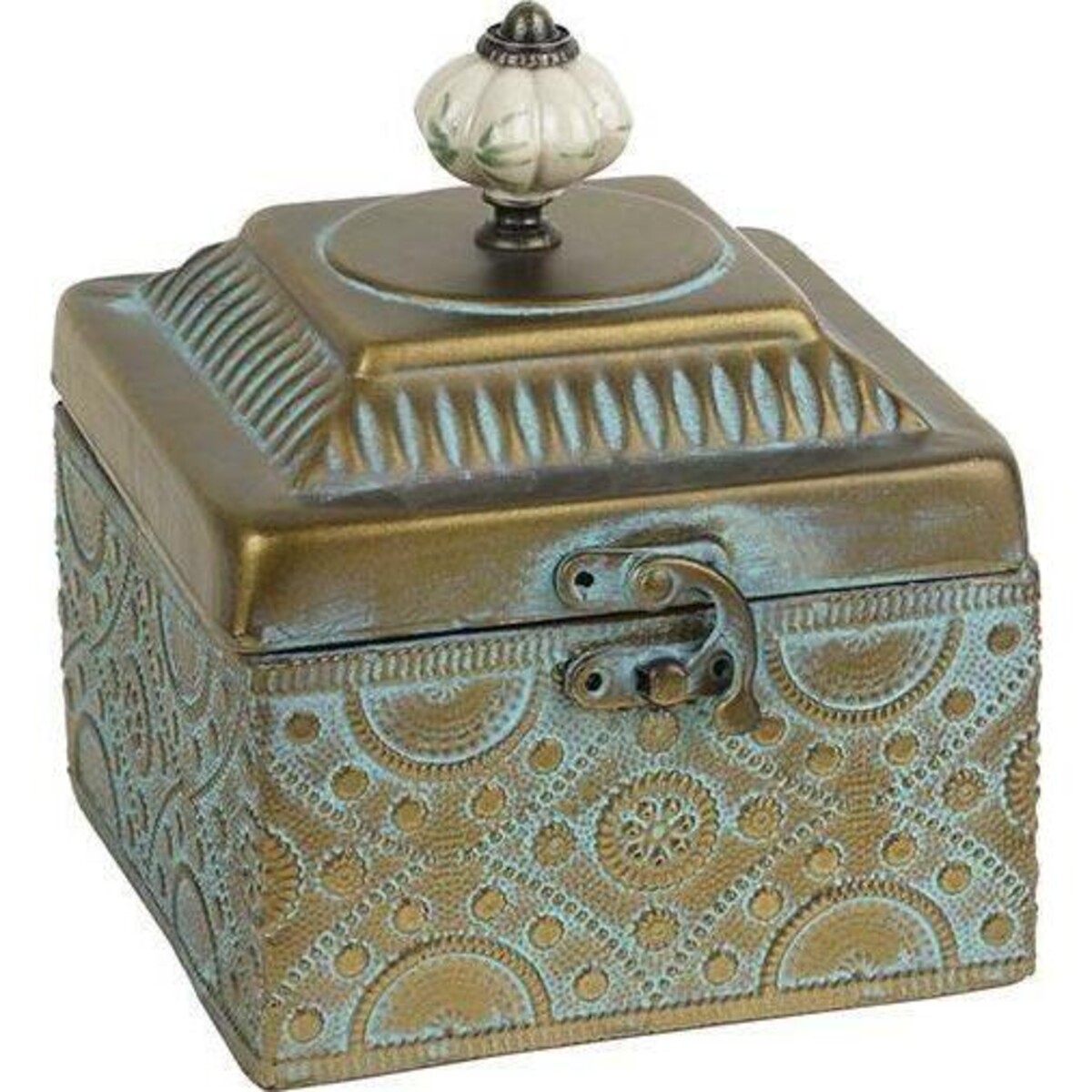 When you go looking for that exclusive trinket box or the special kind of treasure trove that could hold all of those things especially close to you heart - would you settle for anything less than extraordinary! Here is a box that combines the beauty of metal craft with the undeniable respect shown to the ancient craft of metal smithy. The detailing on the box itself is worth a second look, the top can be held with the help of this knob that sit like a little crown - dainty, yet very helpful for leveraging the lid off. The box is all of 13 cm in is dimensions and about 15 cm in height, making its inner compartment quite large enough to keep your special treasures safe. The box has age and distress marks as well as combination of brass like colours and oxidised blue all over its body, making it all the more appealing. Add it to your coffee table, the console or your dresser - placed anywhere e, it is bound to garner a great deal of attention and begin conversations. Comes with a secure latching system as well and sits beautifully firm and proud atop its square base. Regal, royal and very antique in totality.