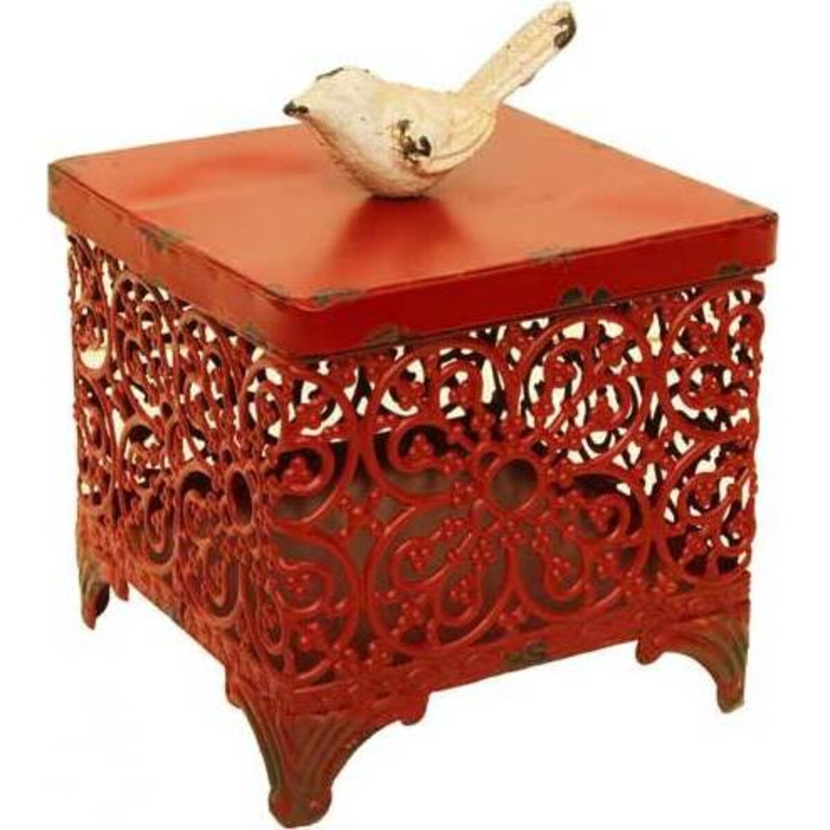 These red boxes consist of a base that features a filigree design as well as four legs to ensure they stay in one place and won't slide. A solid colour red lid sits at the top, and on it is a little cream coloured bird that guards the contents of the box. The decorative accents are slightly worn to give them an aged appearance, as if they were plucked right out of your grandparent's attic. You'll love how beautiful they look wherever you place them in your home.