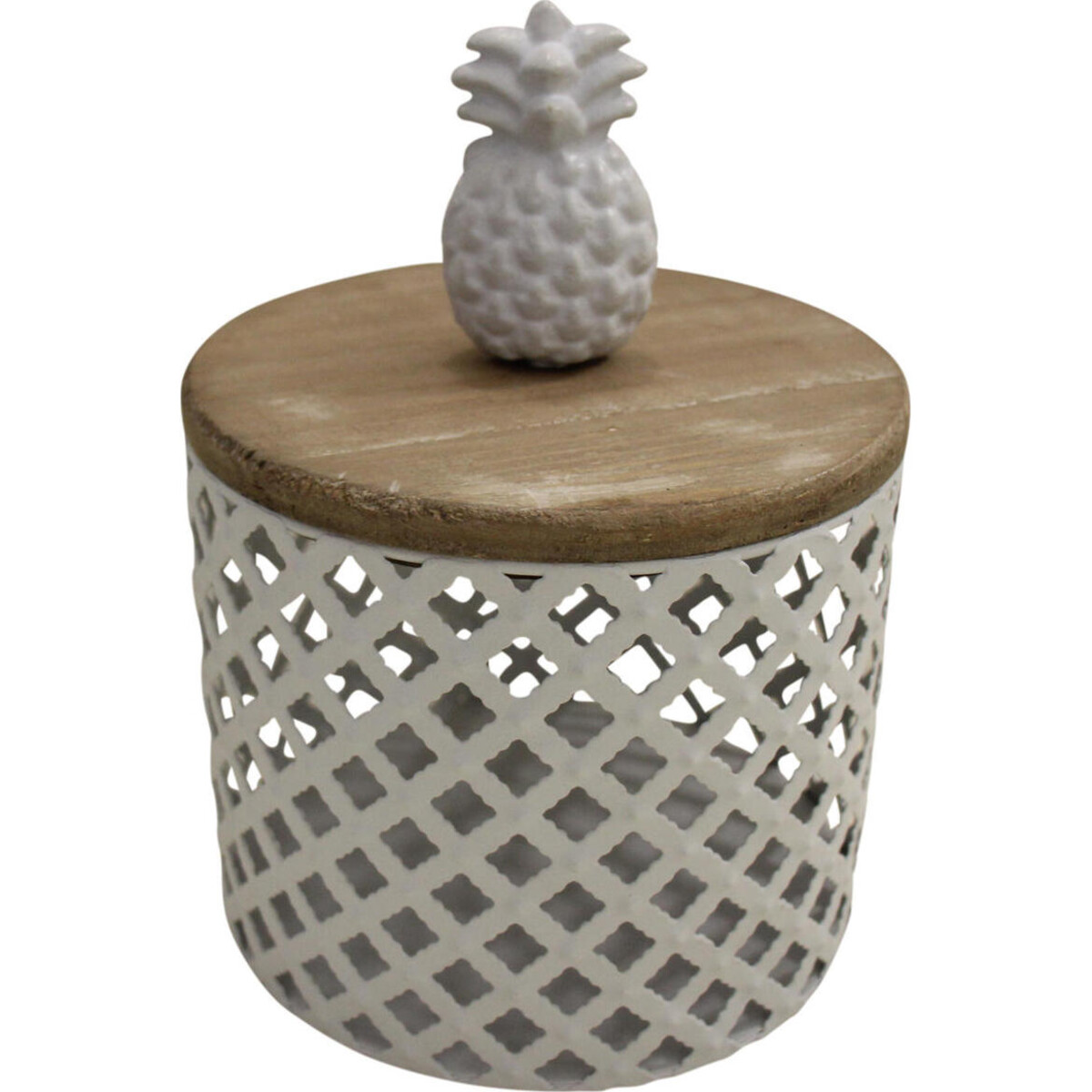 Use it in the children's room - perhaps to keep your toddler's washing or his toys - it could be used to simply stow away some extra provisions in the kitchen well - there is much that can be done with this tiny yet adequately spacious bin that is made from criss crossed stripes of metal that forms the outer body of the case. The wooden top is topped with a knob that is shaped just like a pineapple top. It is in these tiny details that Lavida's designs always come out such winners. The white of the lower body is complemented by the brown of the natural shades of wood and the white pine apple sitting atop the lid adds further to its beauty. The bin is cylindrical in shape and the airiness ensures that you can keep things that need to be kept in contact with fresh air reside in it safely. Makes for lovely little pot holder too, if you wish to see the vines creep through the little gaps and create its own beautiful structure within. A superb means to organize as well as add that touch of quirk in your spaces.