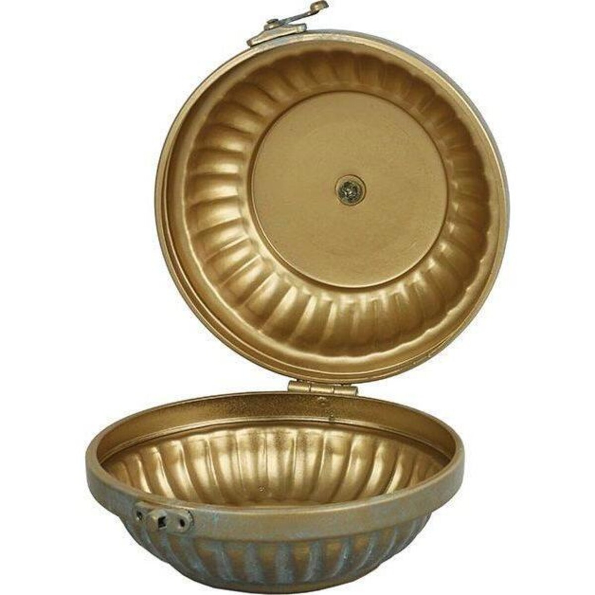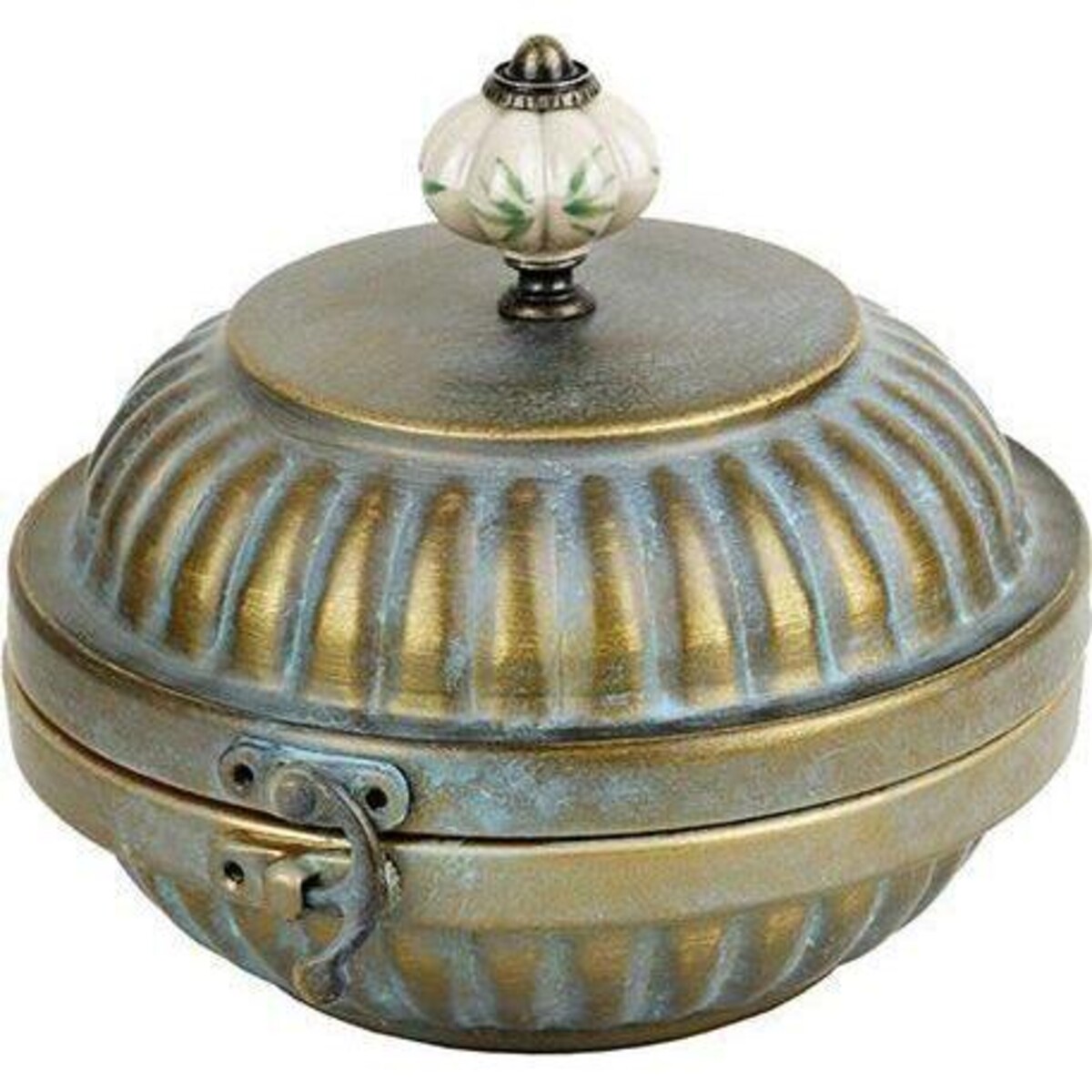 Tiny little boxes are an unconventional means of adding that touch of class albeit the not so traditional way. The heritage that we have of great metal smithy comes from articles that over the ages have graced out homes and have been created by experts who know how to mould and shape the toughest of materials into something so artistic and pleasing to the eye. And this tiny little round case with its ribbed body and charming opening and knob on top - is a living example. The case has a lovely golden burnished colour and has the promise of holing with your tiny little treasures which could be spices, incense, your trinkets or tiny keepsakes. Place t on your dresser, or you bedside table, under the lamp where it will glint gently or in the dresser with all your trinkets safely in its compartment. The height of the case is 13 cm and it rest on its round base while it total diameter is 16 cm.