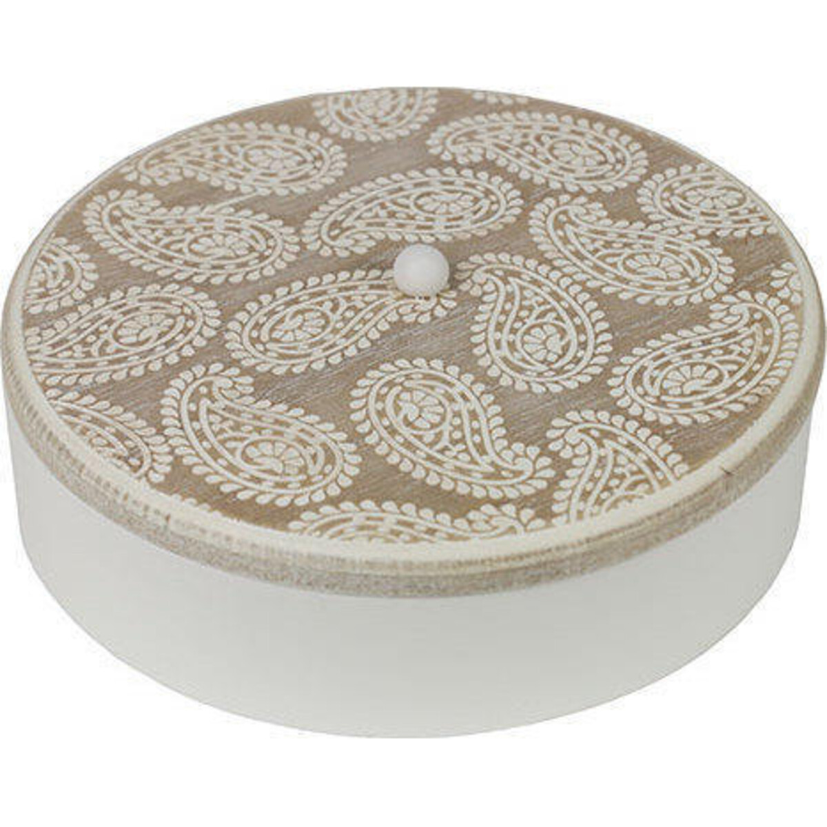If it isn't the fact that the round box has the most ethereal of designs adorning its top then surely it will be knob fitted top that will win your heart over. This MDF made box has a white print that graces its top and the whitish colour wash can be seen all over it. The smoothly opening lid opens up a large compartment which could be used as much for storing your embroidery essentials as it would your trinkets or collectibles. The box has a diameter of 16 cm and s depth of 5 cm. The knob is in white and the paisley design looks graceful on it. The knob is just the right size to allow one to lift up the lid with ease. A dainty and well - designed accessory for your accessories. Gift your graceful home this gorgeous box and see how promptly and easily will you be able to access your most loved possession .