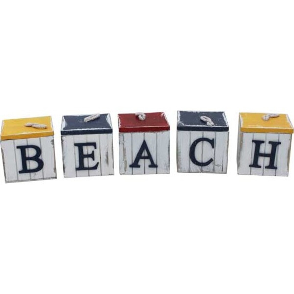 The Boxes - Beach Rope is a set of five small boxes. They are perfect for storing random things in the house. But more than their use as a storage box, they also make fine home d_cor items. They are simply so stylish that they are perfect for adorning tabletops, shelves, glass cabinets, and such. Design-wise, each box comes installed with a sculpted alphabet letter on top. There letters featured include B, E, A, C, and H. If arranged in an order, the boxes can spell the word 'Beach'. Also, each box is adorned with a different beach item - a clamshell, a starfish, a fish, a conch, and a life buoy. Each box is also painted a striped sky blue and white and is decorated with a wounded rope by the base.