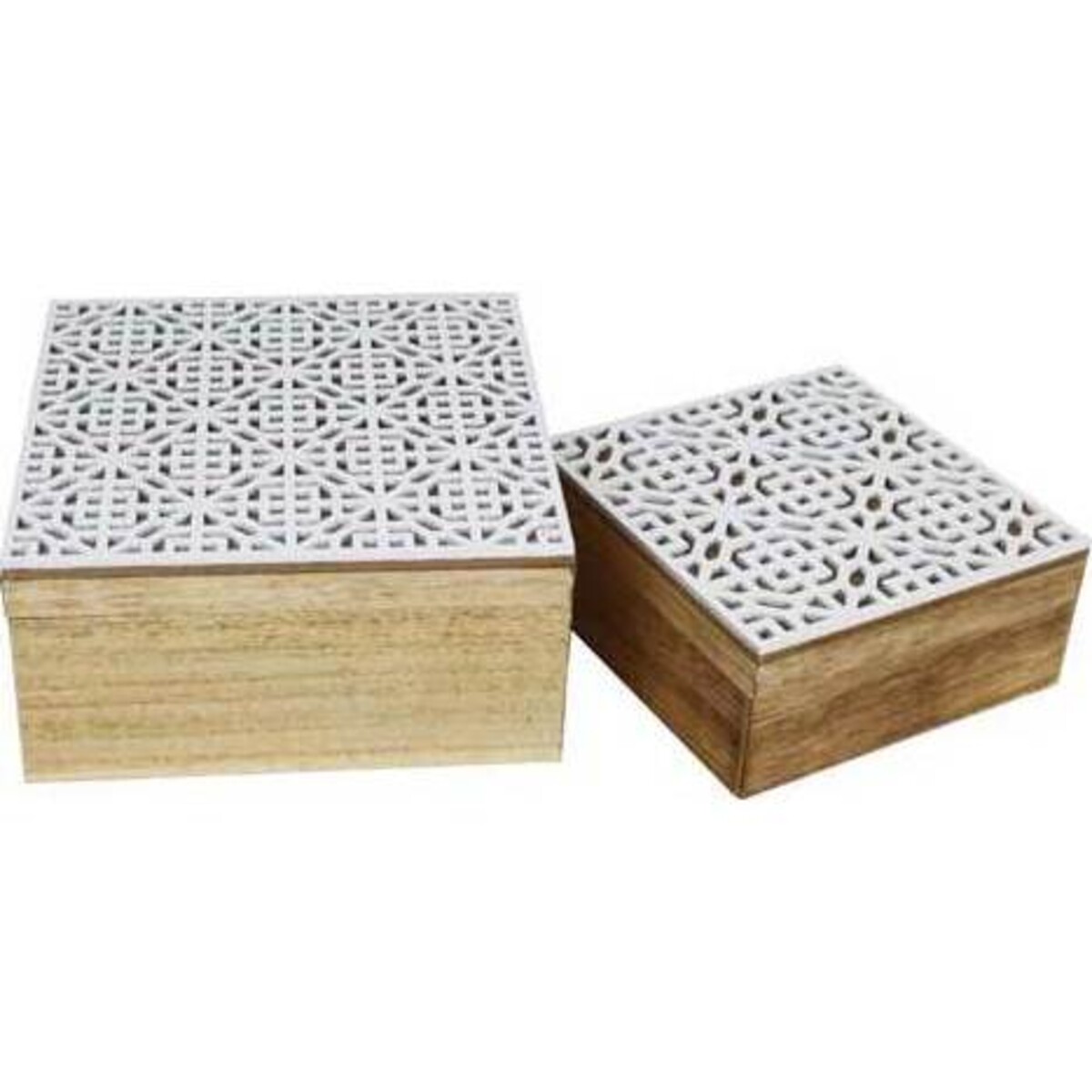 These boxes have a beautiful cut out design in the wood with a contrasting white colour accenting the cut design against a natural wood finish. They are sure to be a popular item this season since they are right in line with top design trends.