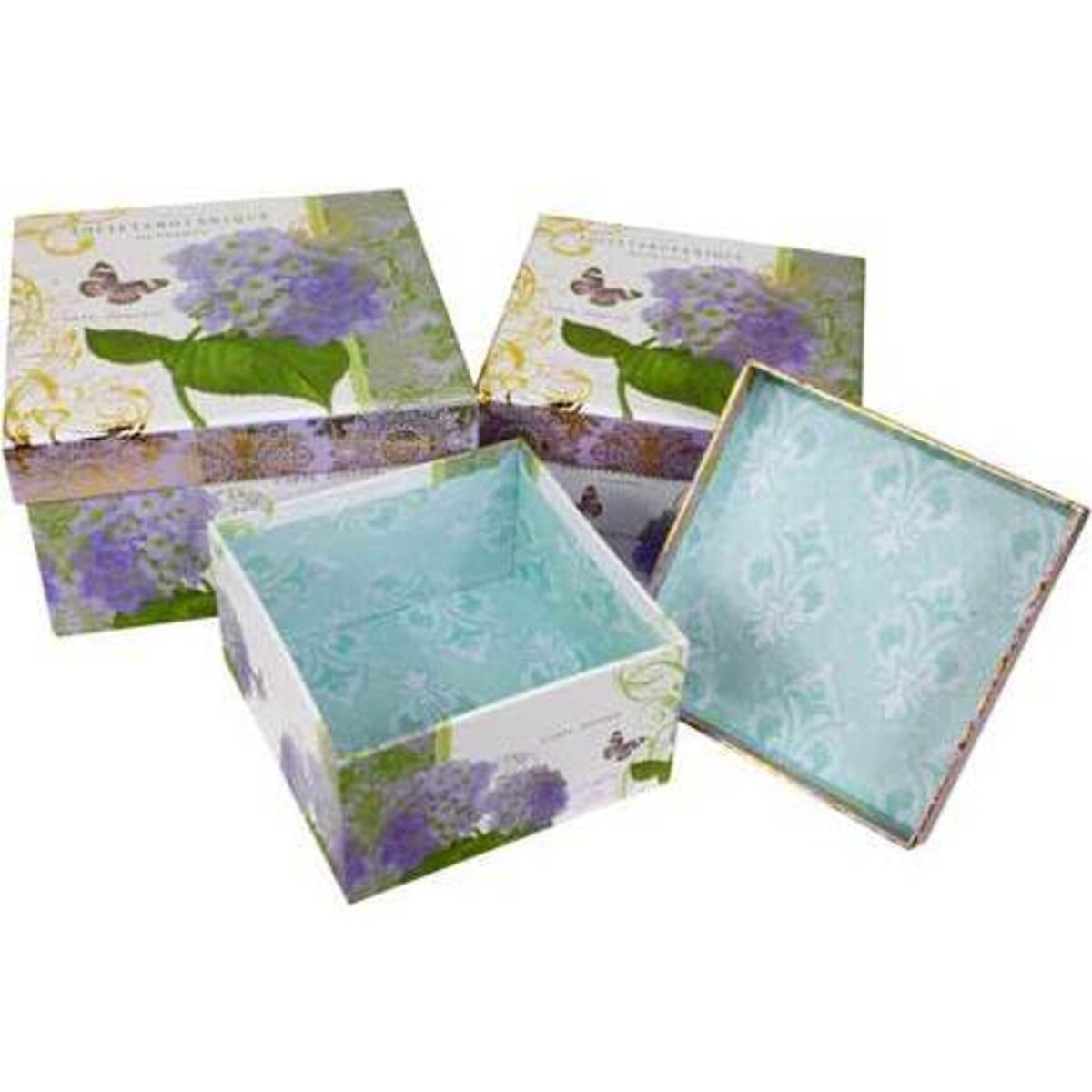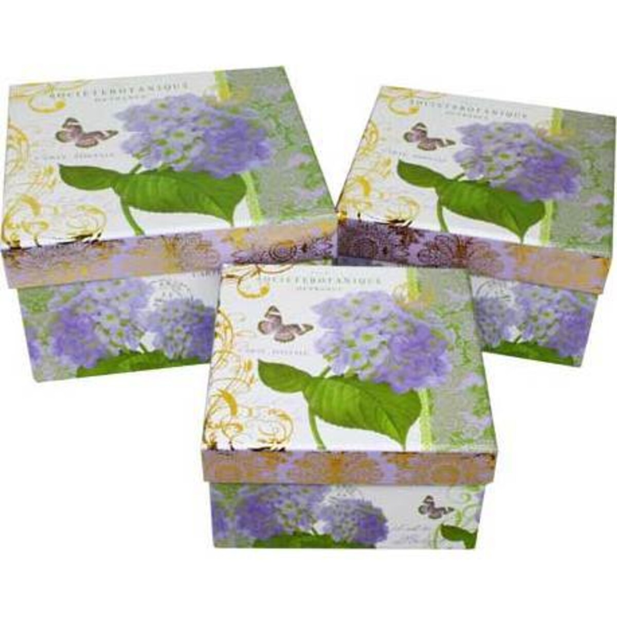 Boxes Hydrangea Purple S/3 features an amazing three - fold set of well - designed boxes. The largest box measures 16x16x10 cm and are formed using paper and cardboard. The outward part comprises of Hydrangea Purple colour, with green, orange and white being the other prominent shades represented. The decoration on these boxes in particular features appealing artwork depicting Hydrangea Purple roses, with their leafy parts visible immediately below them. A person may purchase these tri - set of box cases for domestic usage, where they may be useful for storing books within shelves or neatly in a drawer.