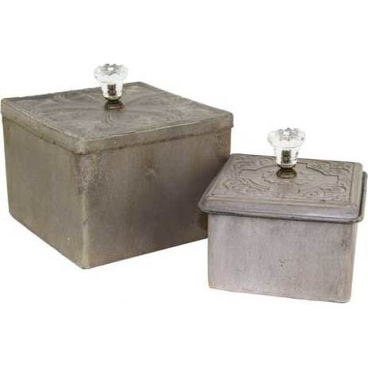 This set of two boxes is made from sturdy metal that possesses an intrinsic look of age and antiquity. Any space would begin to look not just different but also interesting with an addition of neat organizers such as this set of metal boxes. It consists of a dark grey larger box and lighter steel gray smaller tin that both have a lovely pressed design making the box look quite ornate and elegant despite its rustic appeal. The boxes have adequate space to store large number of small objects - right from buttons, to little keepsakes or even jewellery. The knobs on the lid make the closing and opening of the box easy thus simplifying the reaching out for hard to find articles. Placing the set of boxes in any space would also accentuate the shabby chic look .A great gift for someone who loves to keep things simple, non - frilly and utilitarian yet smart and chic.