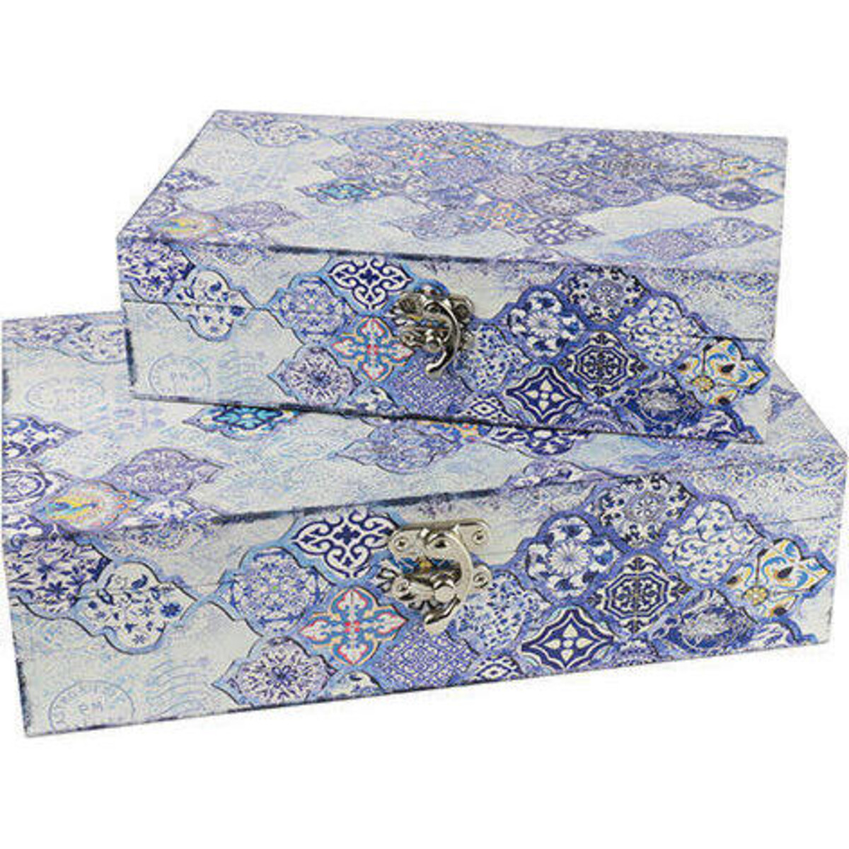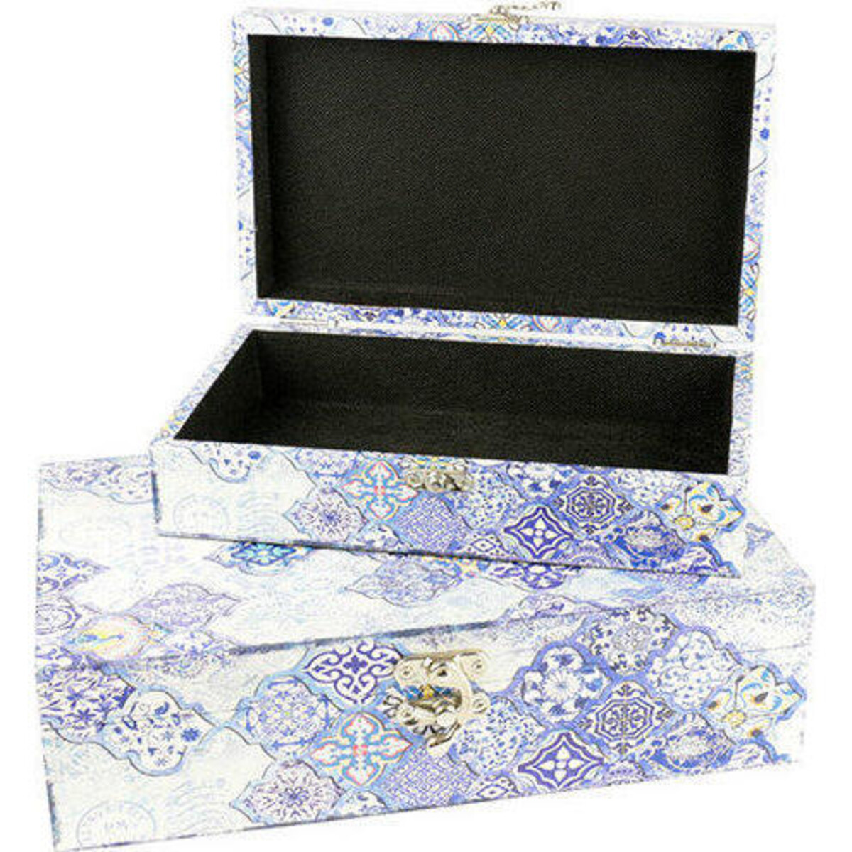 There is always something of a premium that one acquires when it comes to basic home ware and utility from Lavida as they come with a design that defies the look of the spaces as well. Made with an intention of helping better organization, the spacious set of boxes are designed also to help make your spaces come alive with a touch of antique magic. Made of wood and given the soft and subtle print of the glowing quatrefoil design that is very mid - eastern in its influence. This set of boxes would especially be loved for their sturdiness, soft colour and amazing spacious interiors. The two - box set can be kept stacked and would make your desk, dresser or even your bedside arrangement look eclectically classy and very posh indeed. The canvas print that covers the boxes would retain their colour and vibrancy despite much usage and delivers in terms of great looks and a well finished product. The depth and the length of the boxes make them adequately large to hold several of your large and small trinkets and collectibles. In fact, so pretty is its looks that you would not mind posing them like décor articles on coffee tables and consoles for an antique effect.