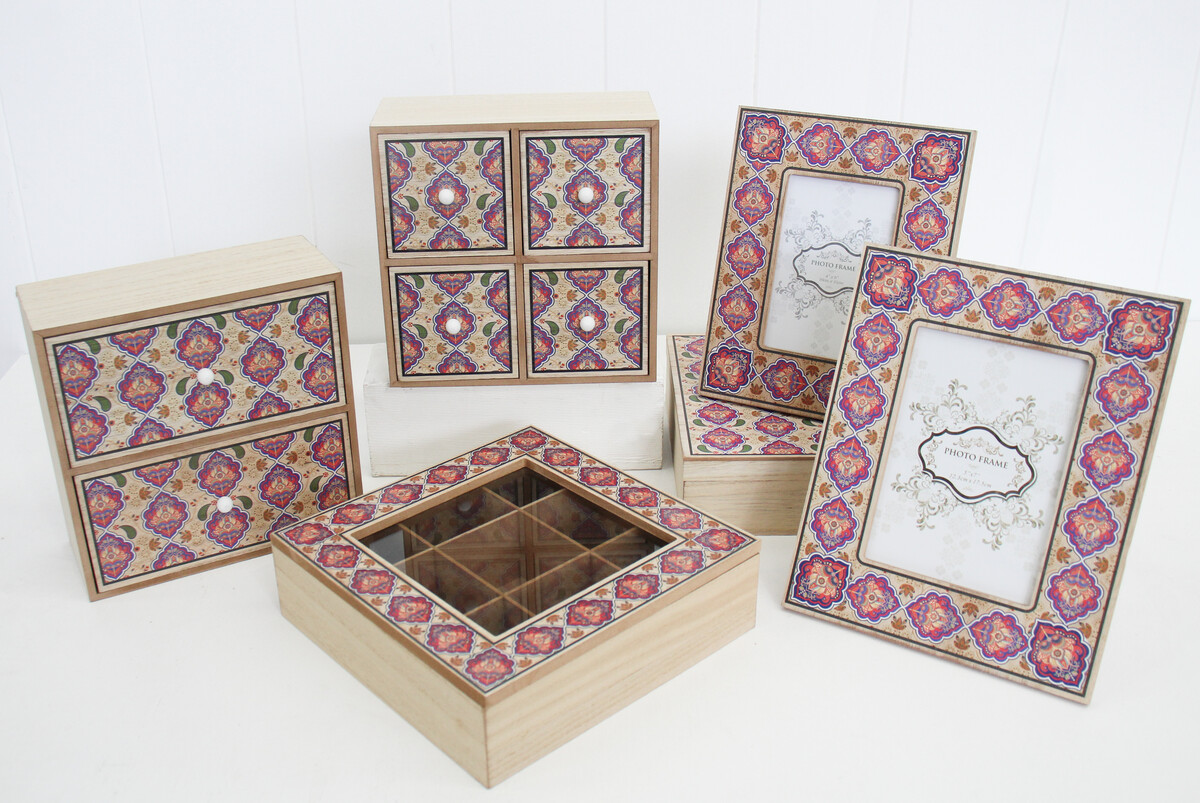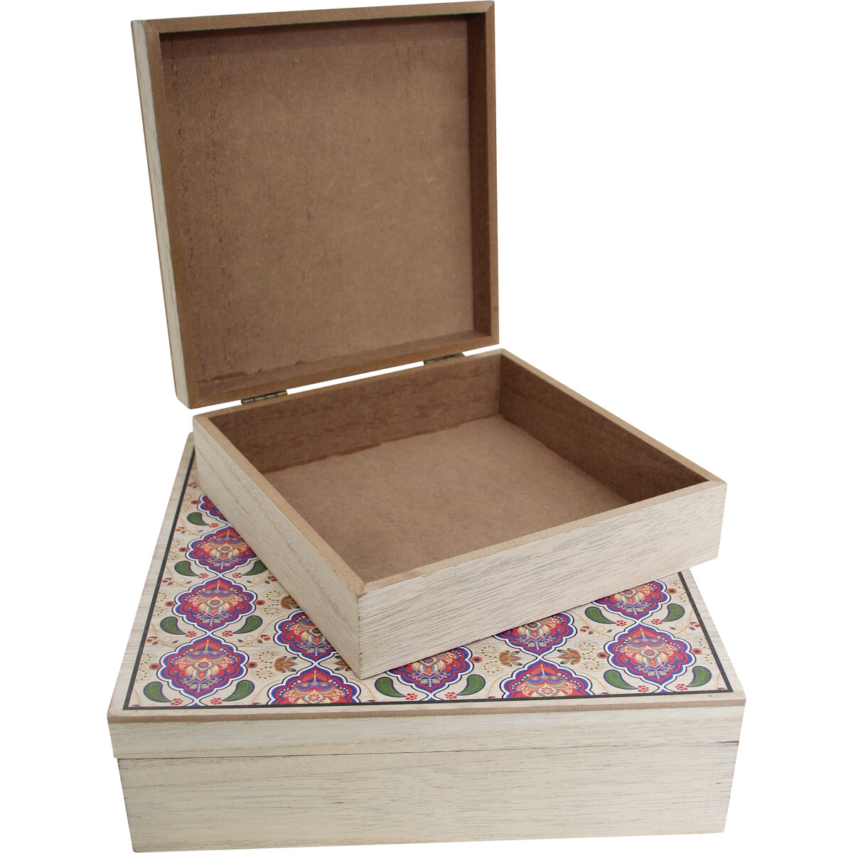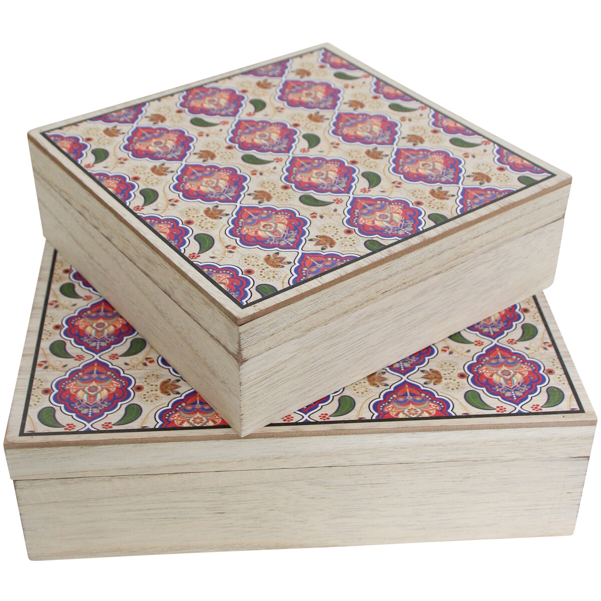 Consisting of two variegated boxes which make up this set, this Boxes Sari S/2 is certainly one of the trendiest and most recent addition to our hugely selling and versatile appealing Wholesale trinket Boxes, Jewellery Boxes and Jewellery Stands. Both boxes are made in the same design and square shapeliness but differ in size and one is made in a large size measuring 24 centimetres in length, 24 centimetres in width and 7 centimetres in height. While the smaller box is made in a dimension which measures 18 centimetres in length, 18 centimetres in width and 6 centimetres in height.