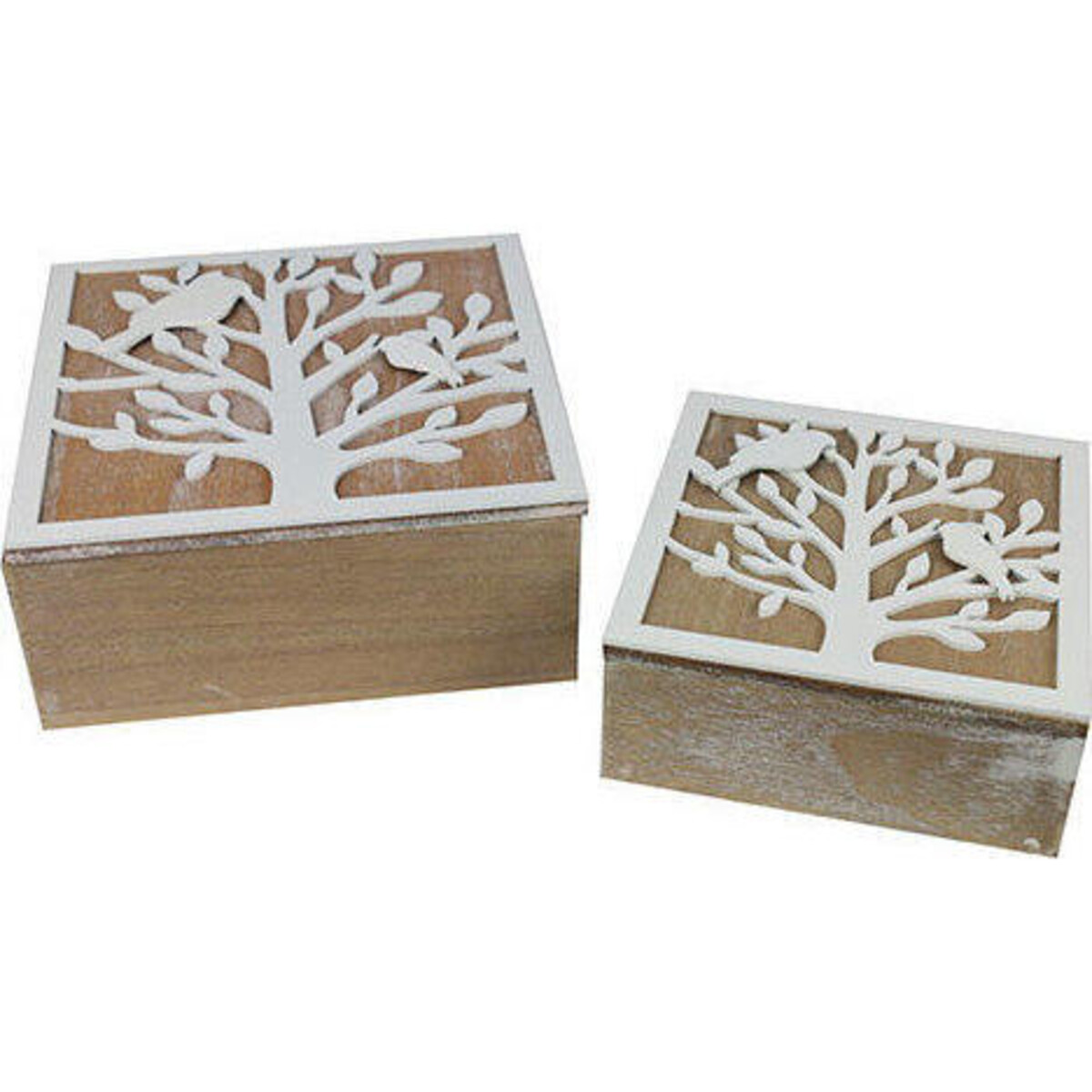 The two boxes have been crafted from wood and the top host a tree design that has been super imposed on the wooden face. The tree has a delicate structure with a bird and branches, as well as foliage all made from MDF. The boxes have compartment that allow you to keep tiny tags, stationery items, or trinkets - one could even use it for storing spices and herbs. There are endless ways in which they could come to use. Apart from giving you a lovely storage space, they also add so much charm to the place where they will be kept. Add it to the dresser or to the kitchen counter - and you will see the space gain a look of stylish splendour that well finished articles from Lavida bring with them. The larger of the boxes is 20 cm in dimension with a depth of 9 cm, while the smaller one is 16 cm in dimension with a depth of 6 cm. the shabby chic white colour wash adds a touch of rustic charm to its otherwise gorgeous good looks.