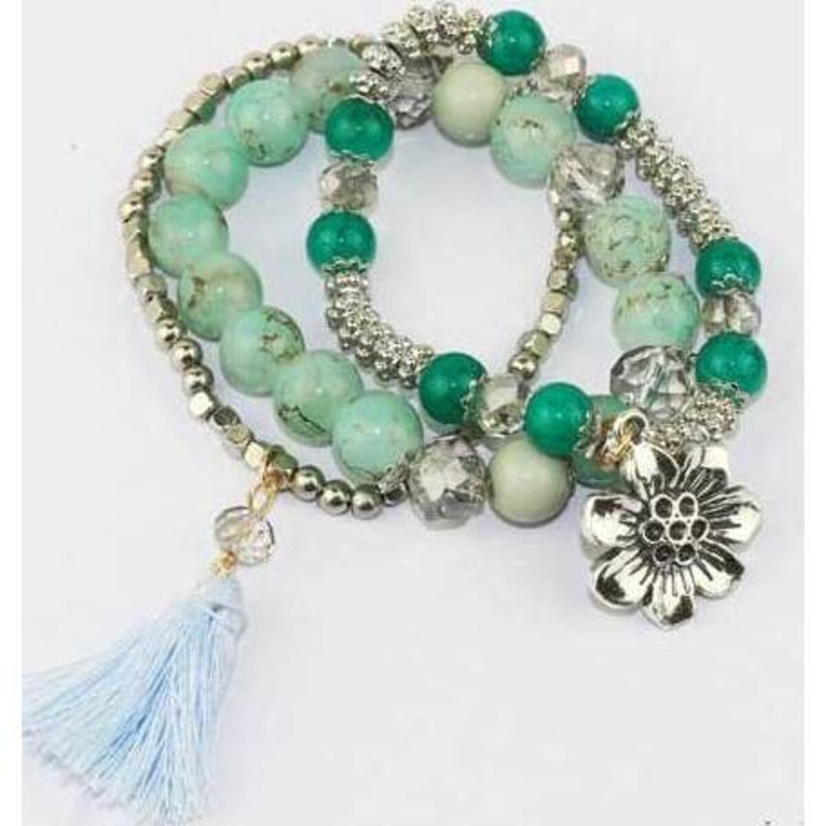 This bracelet set is purely sublime. With some pale green, dark green and even silver pearls, this set has got the style that everyone is looking for. Although your customers might look the best pairing this with the neutral colours that are in fashion, or blues and greens, this bracelet set could easily match with any outfit, and that's what's so appealing about it. Customers will see this and think it's something they can easily wear every day ? something they can rely on to always give their outfit that bit more exquisiteness. This bracelet set is definitely something you should not look past; its blue tassels will be the highlight of the sale and will get everyone excited!
