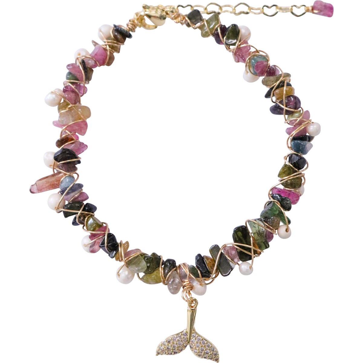 Okay, we’re a little bit obsessed with this one. This bracelet’s like bringing all the colour of autumn right into your customers’ jewellery box - or shop, for that matter. Natural tourmaline stones bring out those rich reds and deep olive greens, then we wrap it all in gold wire. Oh, and real freshwater pearls. It’s really beautiful and there’s something about the way we’ve mixed the autumny rainbow stones that makes it feel - well, pretty luxurious but still fun enough to wear with a t-shirt. And then there’s the little tail pendant at the bottom. The gold setting is textured and covered in sparkly rhinestones.