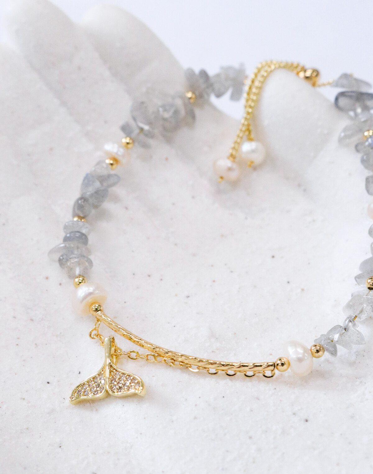 Ideal for enhancing home or office decor, this bracelet can be artfully displayed on decorative trays, jewellery stands, or within shadow boxes, adding a touch of luxury and refinement to any space. Its enchanting combination of pearls and moonstone makes it a timeless piece coveted by consumers who appreciate craftsmanship and natural beauty.