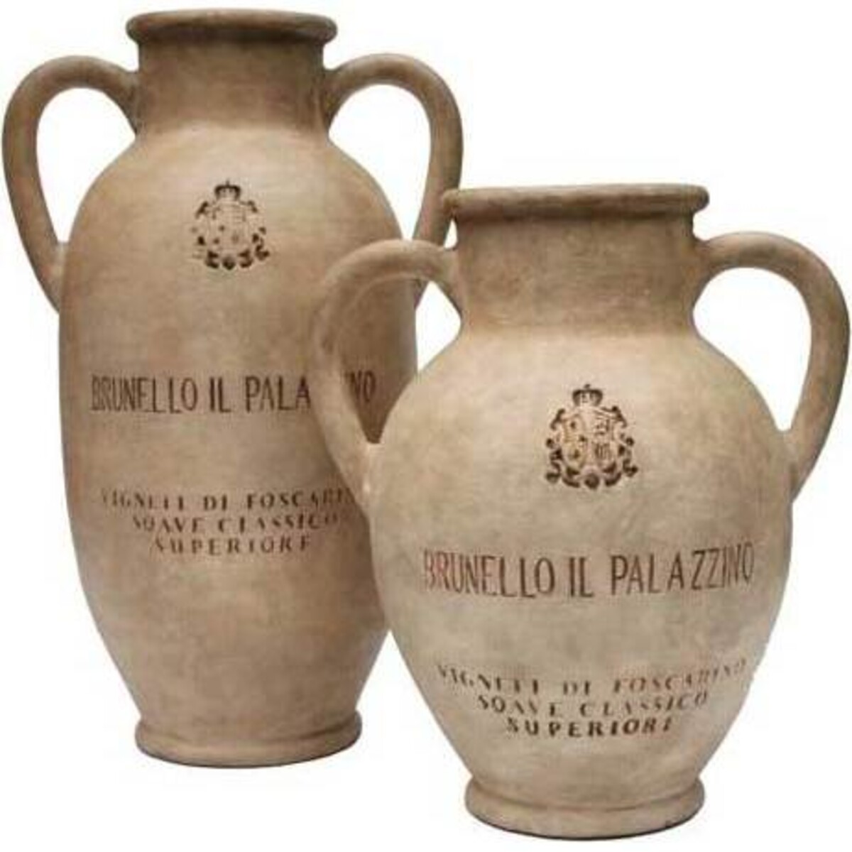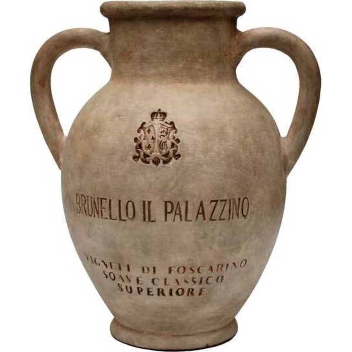 This tan jug-style vase features two handles on either side, a carved detail at the top and the words "Brunello Il Palazzino; Vigneti Di Foscarino Soave Classico Superiore" across the bottom half. While this vase may look like it exists from decades past and came right from an antique shop, you got this fabulous piece all for an affordable price and without all the searching. Whether you display it as is or fill it with flowers, it's going to be a lovely addition to your home.