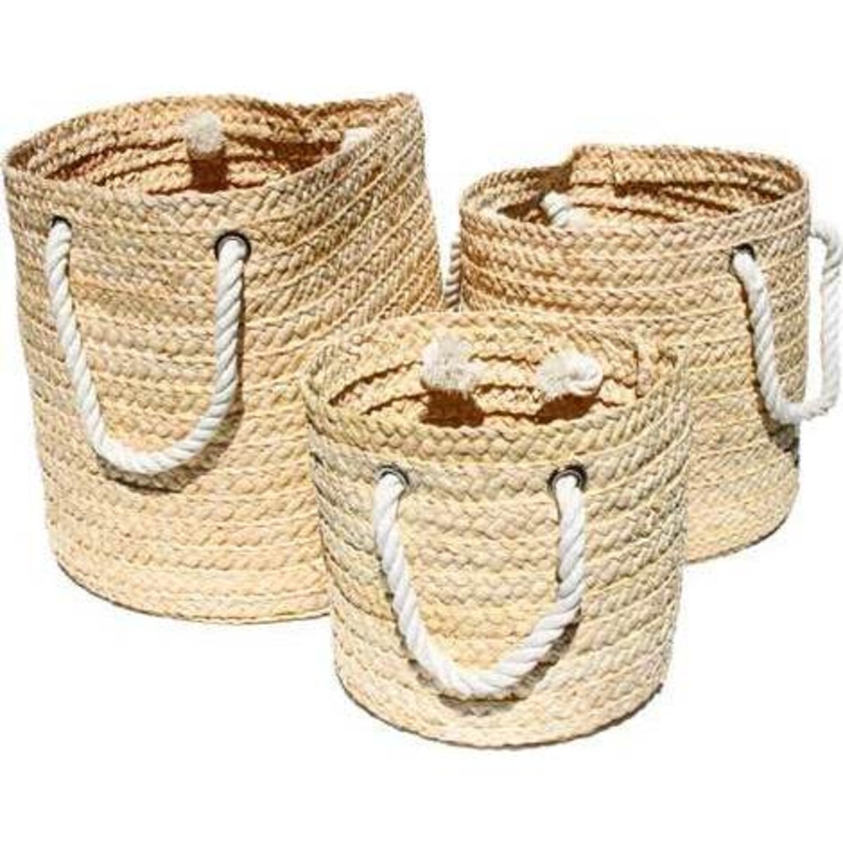 The age old craft of weaving has been taken notches higher with a stylish and fun design seen in this set of nesting bags made from rope and woven into a set of three bags that are deep, spacious and also designed in such a way that they can nestle into each other. These classic woven bags are about 41 cm in width and depth which makes them very convenient to hold any kind of storage that one may need to have around homes and offices as well. Because of their lightweight yet sturdy built, they would suit perfectly for office or stationery storage fitting well into shelves as all of these bags have flat bases and sides that do not collapse. It is this stiffness in the weave that makes it all the more convenient for storing items that must not bend or crease. The rope handles are soft and long and this would allow easy carrying. Be it for picnics or carrying one's shopping, these bucket bags fit in naturally with all such needs.