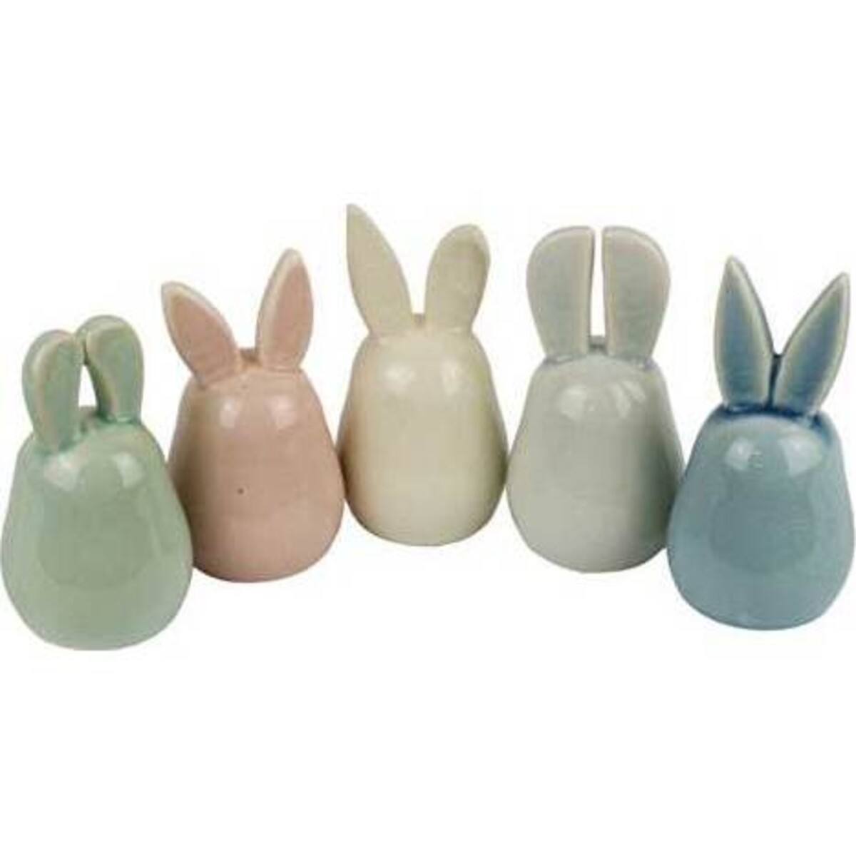 One cannot truly work on creating a farm and cottage feel ambience in the decor if one does not have the company of creatures such as cockerels, pigs, cows and bunnies. The perky eared animal that is adorable in every respect commands so much attention not just because of its cute little size but also because of the manner in which something as definitive as a bunny has been given a completely new style of depiction. This set of five could be clubbed and clustered together in high and low spaces. Each tiny figure is about 12 cm high with 6 cm round bodies. The ears stand out in their shape - each very different from the other and the colours for each, delicate shades of pink, green, blue beige and off white makes them so stunning in their quietness. The bunnies could be placed on mantles, bookshelves, on the coffee tables, sideboards or wherever be you feel the need to enhance the farm feel a little bit more. They will be loved for their unique design, the smooth finish to the exteriors and the design detailing the form of the ears. One could rotate its placement in any part of the house.