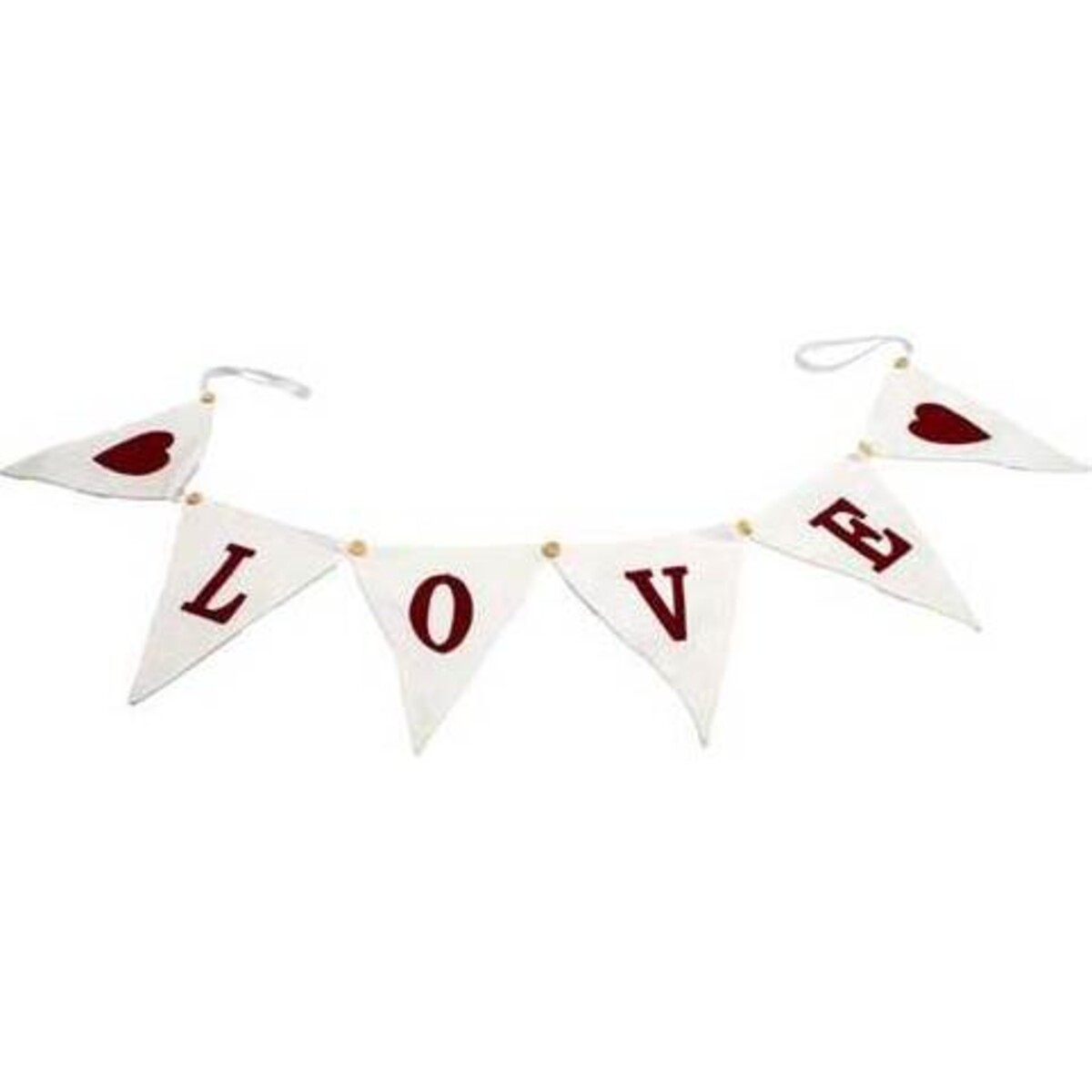 • Six triangle flags make up the bunting. The two on the ends bear a heart motif and the four in the center are emblazoned with the letters LOV E in large letters.