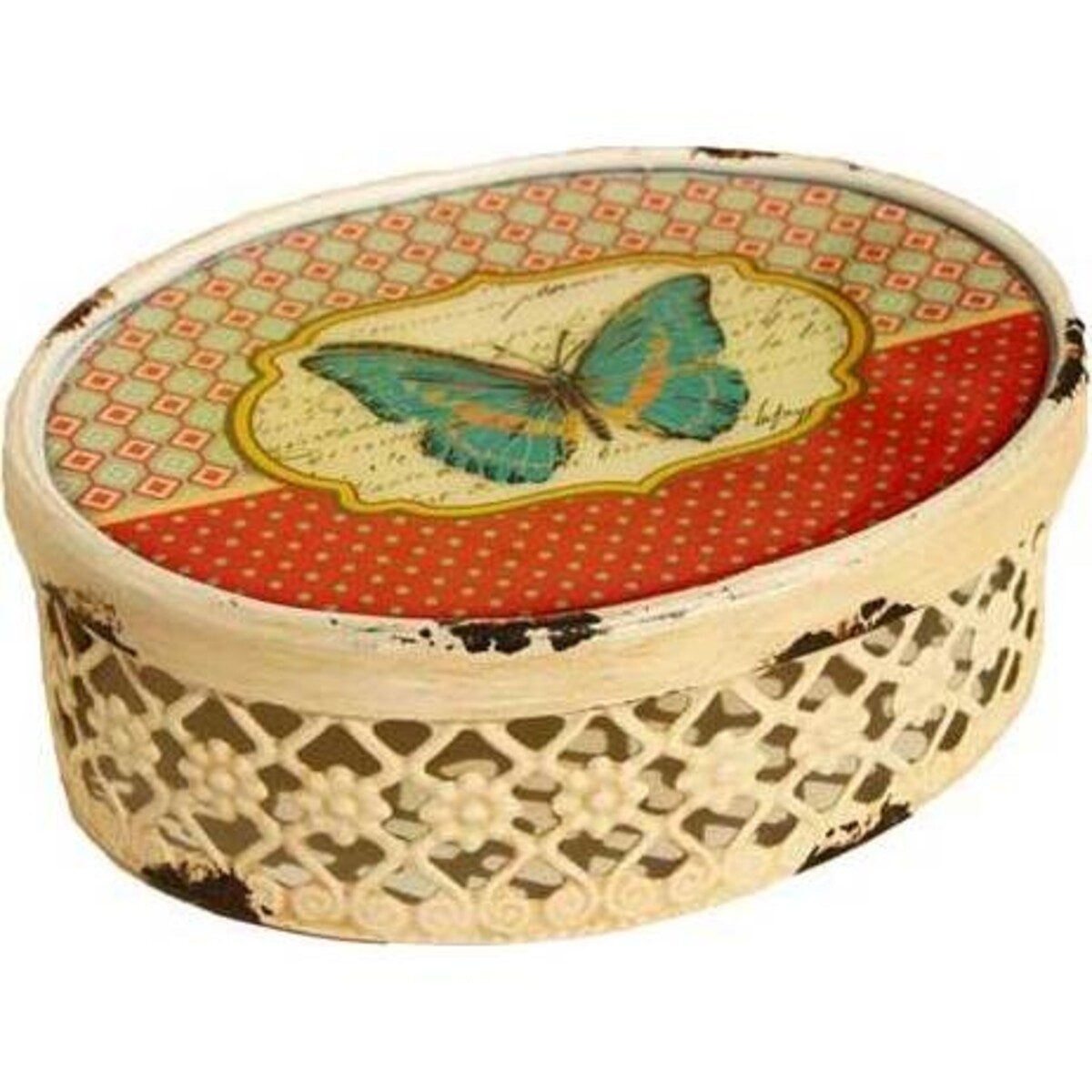 The beautiful cream - coloured boxes feature a floral and filigree design all along the sides while the top showcases a green and orange pattern with a blue butterfly at the centre. The boxes are slightly worn and weathered in spots to give the illusion that they've been well - used for years, yet still retain their original charm. They're perfect to hold a variety of items ranging from jewellery to little mementos. Although the boxes would look lovely in any room of your home, they're ideal to give as gifts, especially to those who adore butterflies or nature - inspired decorative accents.