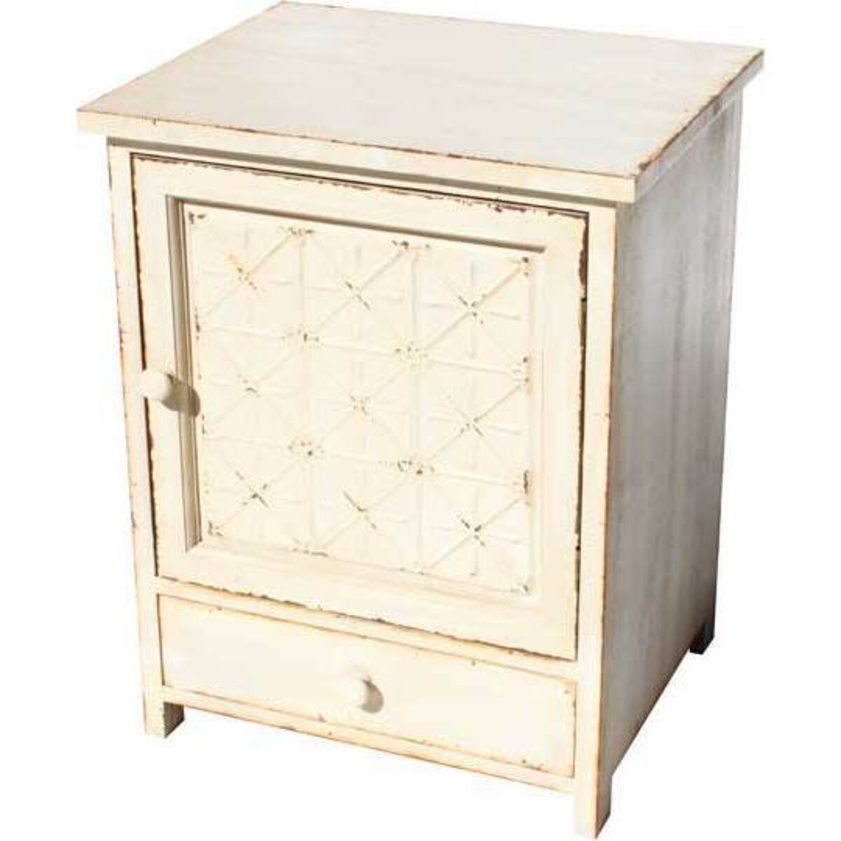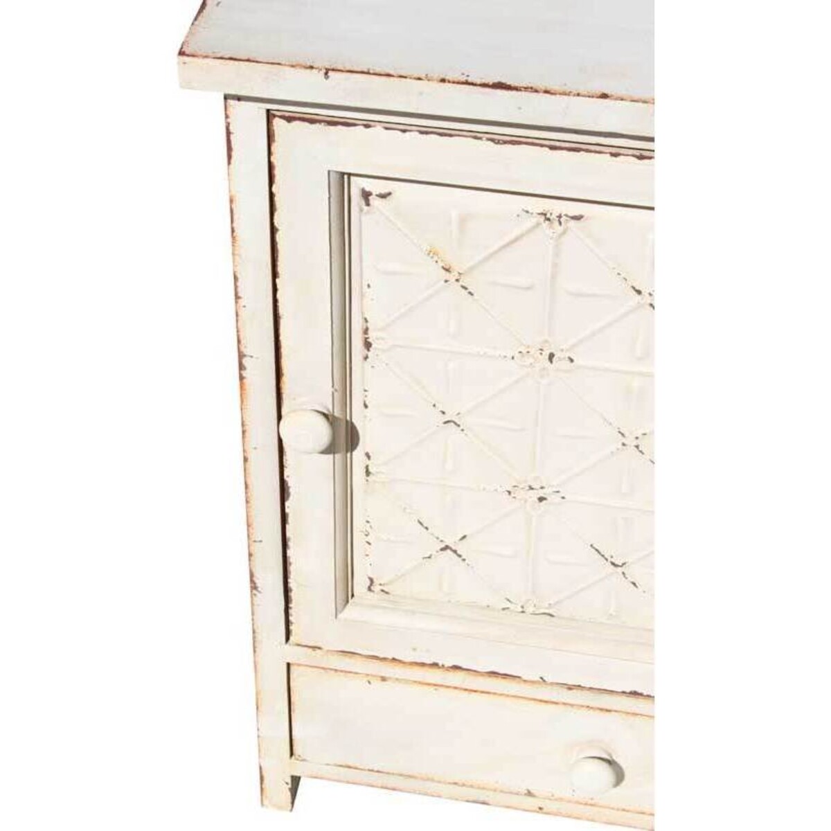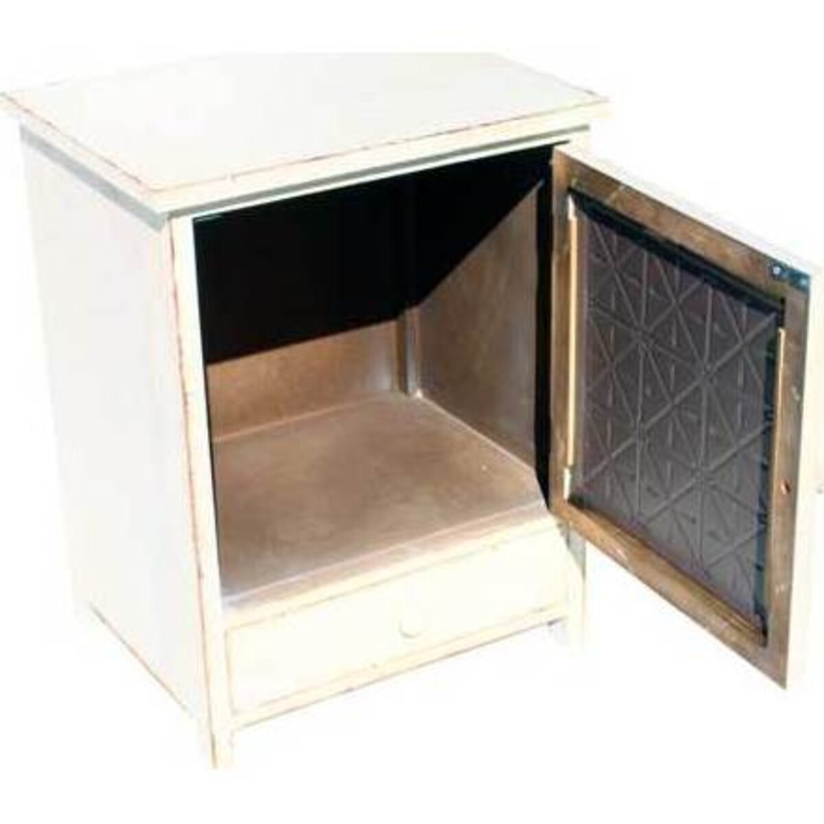 What captures the eye is the gorgeous shabby chic detailing on the white pained surface. The frontage has a subtle pattern on the door and it also has a white knob drawer at the base which makes the look all the more vintage and very chic. The dull white of the paint is peeling in certain places and that makes the look of this cabinet very period look indeed. The spaces in the cabinet are great for keeping books, collectibles and any other personal belongings. If used in the kitchen or the dining room it would serve well as storage for crockery and serve ware. The solid wood styling makes it a sturdy and reliable cabinet in terms of durability. It stands about 56 cm in height and 44 cm in width making its top work well as table top. It could be kept next to the bed and would work as a bedside table.