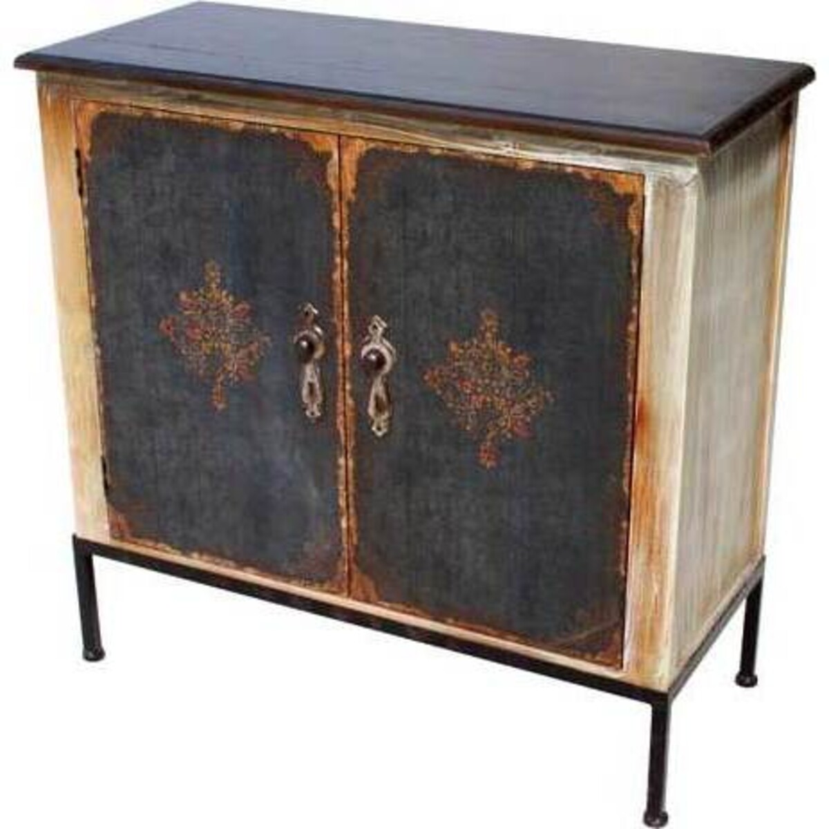 These cabinets feature a black top, black legs, black doors, and cream - coloured sides. The doors feature an elegant design at the centre of each as well as black hardware. The cabinets are worn to give them an aged appearance, as if you found them at a thrift store and couldn't wait to bring them home and make them yours. There's plenty of space to store your items inside, as well as ample room to display items on top. You'll love how much style they bring to your space.