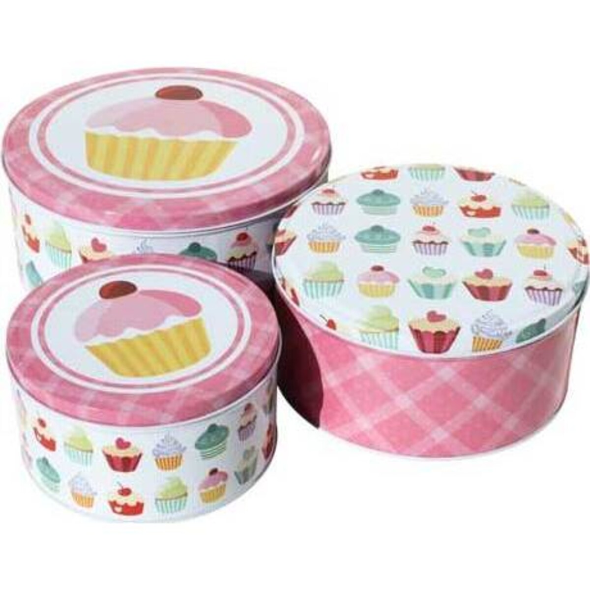 The tins come in three different sizes, the smallest and largest of which features a white background with tiny decorative cupcakes all over the bottom half, a large pink cupcake in the center of the lid, and a pink plaid border around the edge. The medium-sized tin has a pink plaid bottom half with a lid that's covered in tiny bright cupcakes. Whether you stuff them full of delicious treats or with small trinkets, you'll adore displaying these tins in your home.