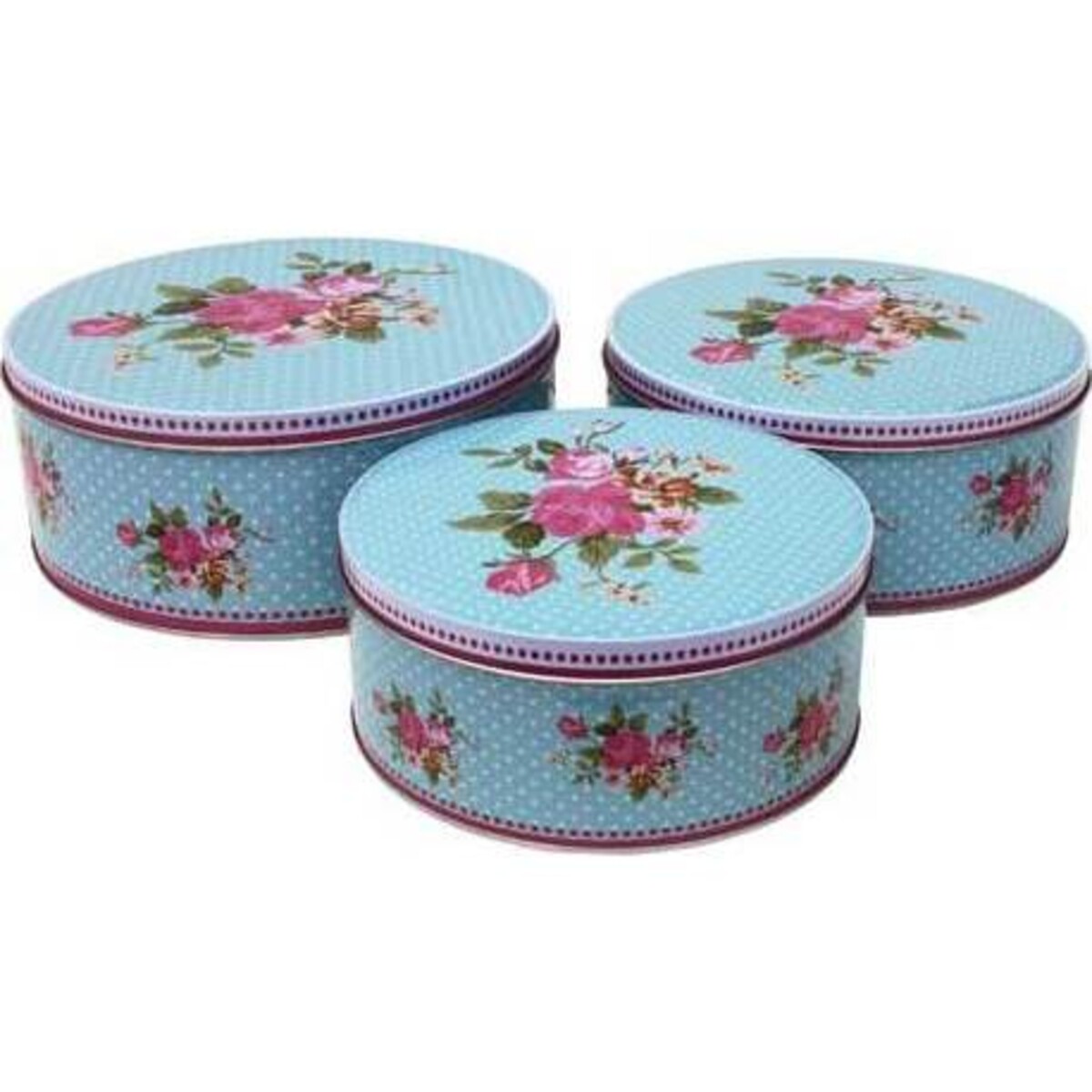 Cake Tin Rose Dot Pink S/3 is a set of three cylindrical sky blue tins with dots of white which are equal in size. They are covered with lids which have threads at the folded tips to facilitate easy opening by users. Pink roses are visible all around the cake tins, which are ideal kitchenware for storing cakes and biscuits. As well, these tins are a great gift set for a homemaker. The storage facilities appear brilliant when placed on a dining table. Their tin construction implies they are durable and keep contents cool and dry at all times.