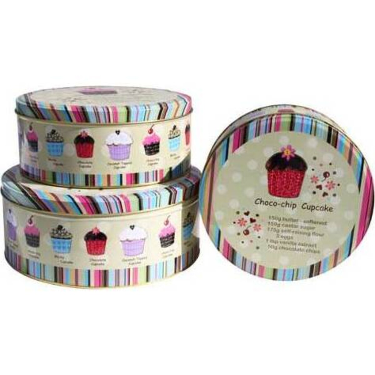 This one is as cute as can be with everything anyone will need to create delicious Choco-Chip Cupcakes printed right on the outside of tin lid where everyone can see it. • Each unit is a set of 3 tins in 2 sizes. • The cream coloured tin and lid have decorative stripes that run around the top and bottom in a multitude of candy or ice cream colours. • The outside of the tin features graphics of various types of cupcakes and their names that decorates all the way around. • The recipe is on the lid with ingredients, a picture, and flowers set against the cream and white polka dot background.