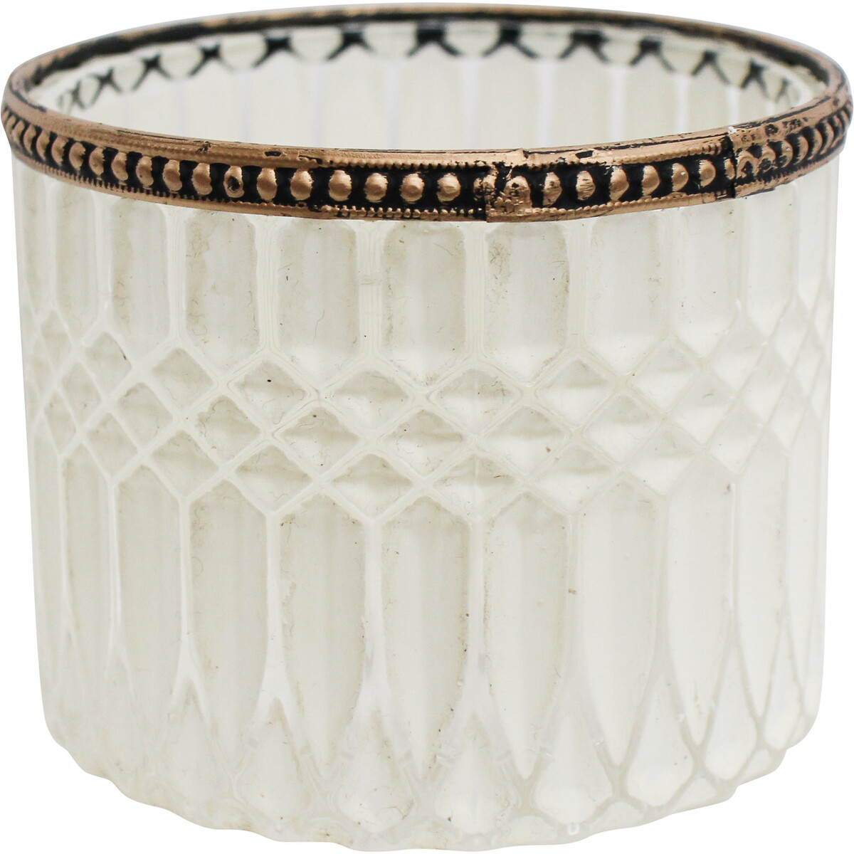 Showcasing the use and combination of premium quality materials, the Candle Artsy White features an unconventionally stylish enduring appeal given the tastefully crafted form of its candle holder. With the candle holder made through the use of pure quality translucent glass material and having its rim ornately decorated with bronze coloured wrought metal, it contains pure refined wax within which is a single long burning wick for that romantic, soothing, illuminating glow which your customers desire. The generally white outlook would fit in perfectly with all décor.