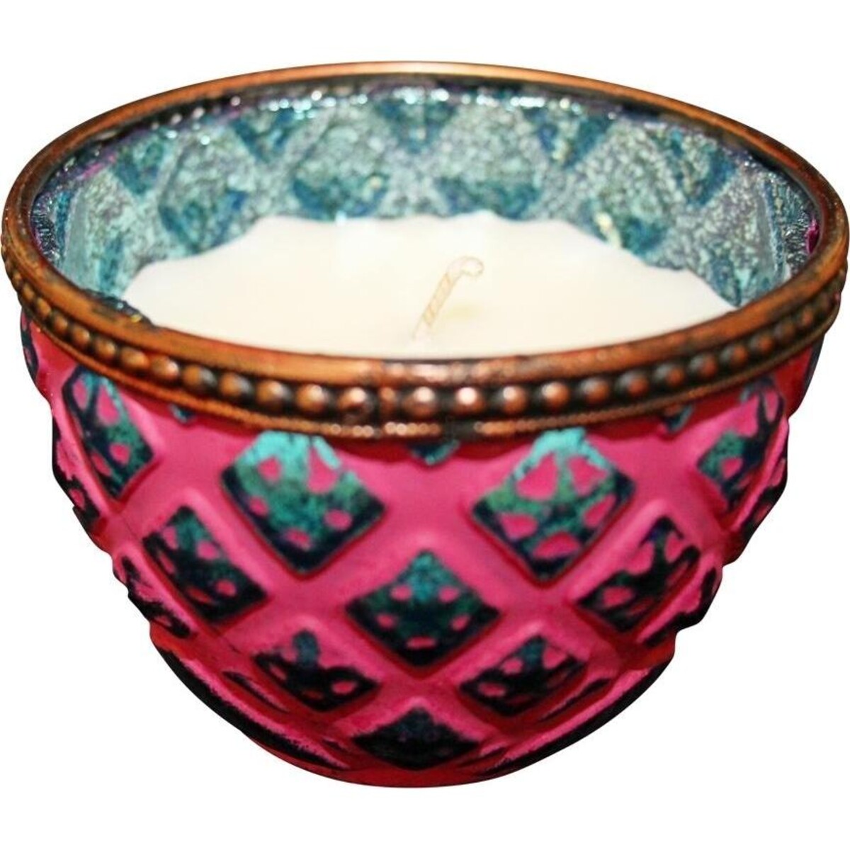 Mellow candlelight relaxes and makes the space feel more ambient-ready for you to destress and forget the rush of things that our everyday is all about. This glass votive lends your décor not just a fascinating lighting option that can be shifted and placed where you need it most, but also ads that touch of colour in the form of its blur and pink shades that adorns its exterior and interiors. The textured finish adds a design detail and the dimpled metal rings a touch of metal glitter. The height too is the kind that will allow it to look as pretty on the shelf as it would on your bedside or coffee table. Touch up your spaces with twinkling candlelight and make relaxation a part of the evening?s schedule. You simply need a few votives of this kind placed in vantage spots and your home will absorb the beauty and the soft lighting effect to recreate the look in whole new way. Once the wax is sued up, you could use the glass container for placing tiny tealights.