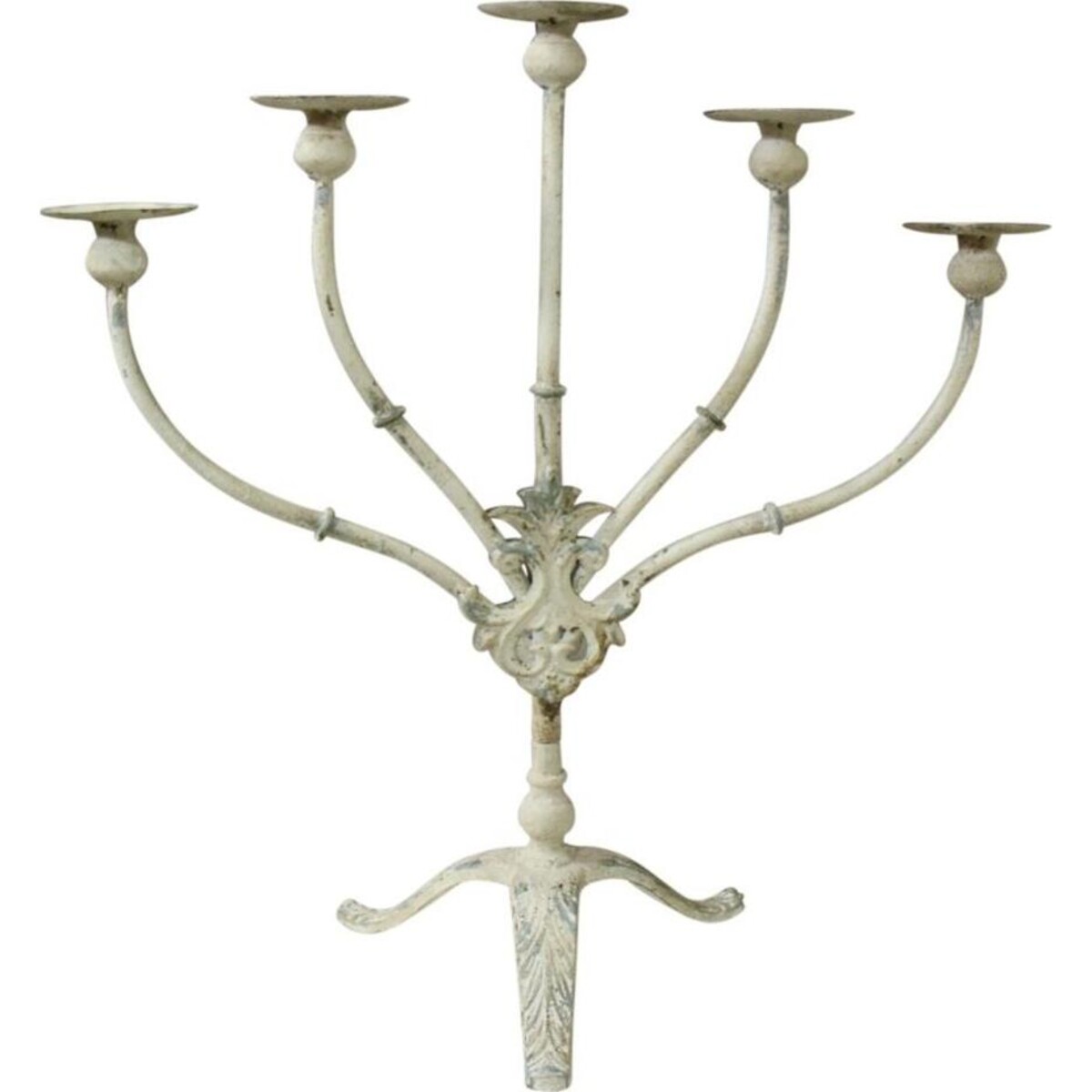 Candle stand come in many shapes and sizes, but this piece with multiple raised arms allowing placing of dinner candles at varying heights adds a design to the usage as well. A superb blend of imaginative and creative thinking wherein the candle holder will allow one gradient form of candle placing adding thus a delightful detailing to the whole effect. The height of this multi prong holder is altogether 75 cm in height and pans out to almost the same width the tallest prime mast holds the candle the highest while the shorter arms holds two on each side at a lower height. This creates an interesting formation that will be the statement piece at formal dinners. Will also look stunning when placed on the side board or the console. The balance in the piece comes from an understanding that the height and width have been well balanced. Stands well on its metal base and wears signs of age and distressing most gracefully.