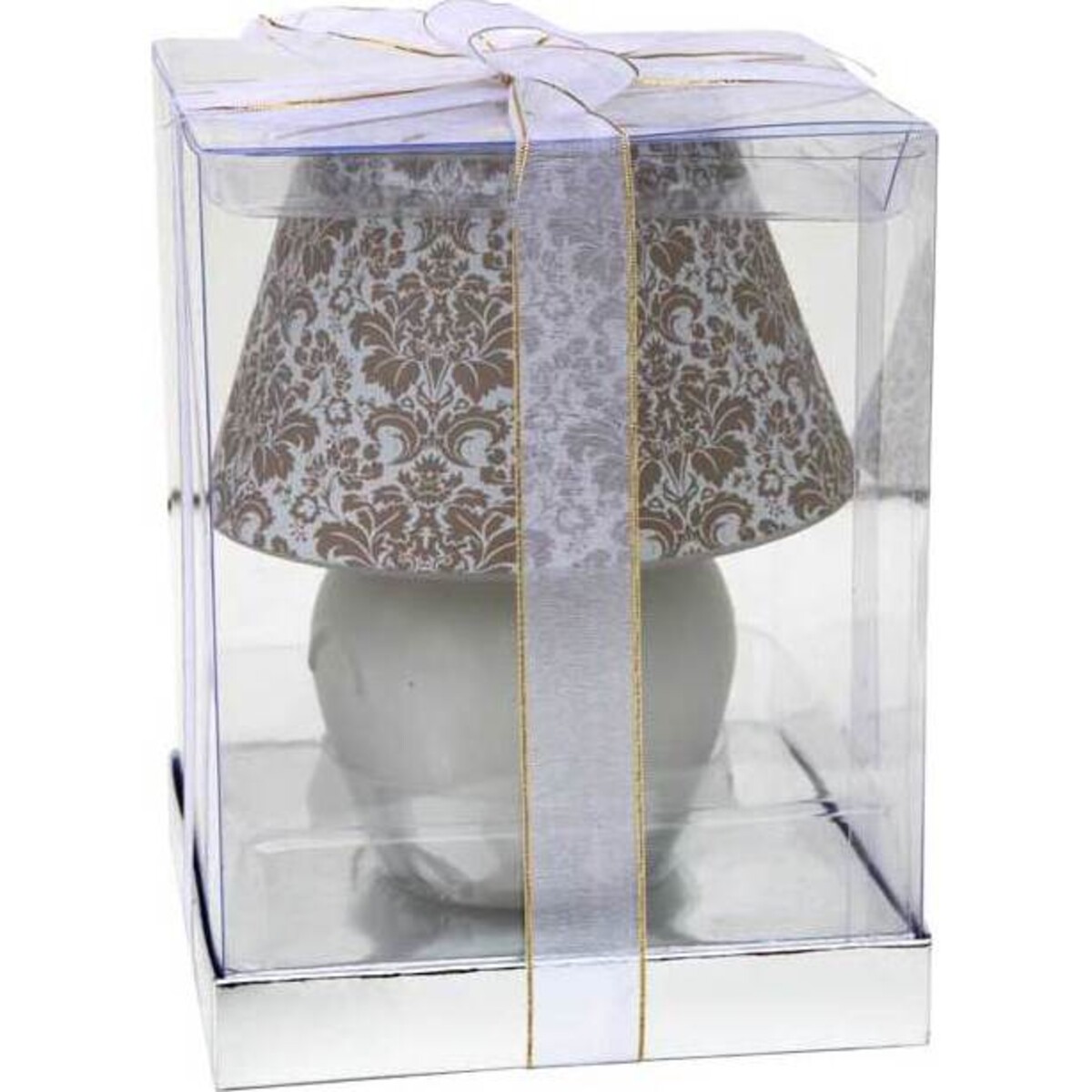 • LaVida's Baroque Cream Candle Lamp has a soft white base in the shape of a small vase or ginger jar. • The shade is made from linen like fabric with a chocolate brown Baroque pattern of leaves, scrolls, and other foliate forms on a creamy white background. • A votive candle placed at the top gives a soft glow through the bell shaped shade. • Candles are not included and can be purchased separately. • Candle lamps come gift boxed in a clear plastic container with a silver base, and are wrapped with sheer white nylon ribbon and bow with gold trim. • Perfect for gift, home goods, and candle departments.