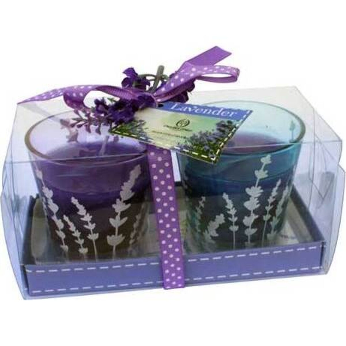 This Lavender Sprig Candle Set is what you go for when you know that style matters, even in the smallest forms. The blue and purple holders each contain a purple lavender candle and have white lavender detailing on the outside designed to offset and complement the bright colours. You'll get each set of candles in a clear and purple box with a purple and white ribbon wrapped around it, and on top, a sprig of lavender, because in the end, it's the littlest details that matter.