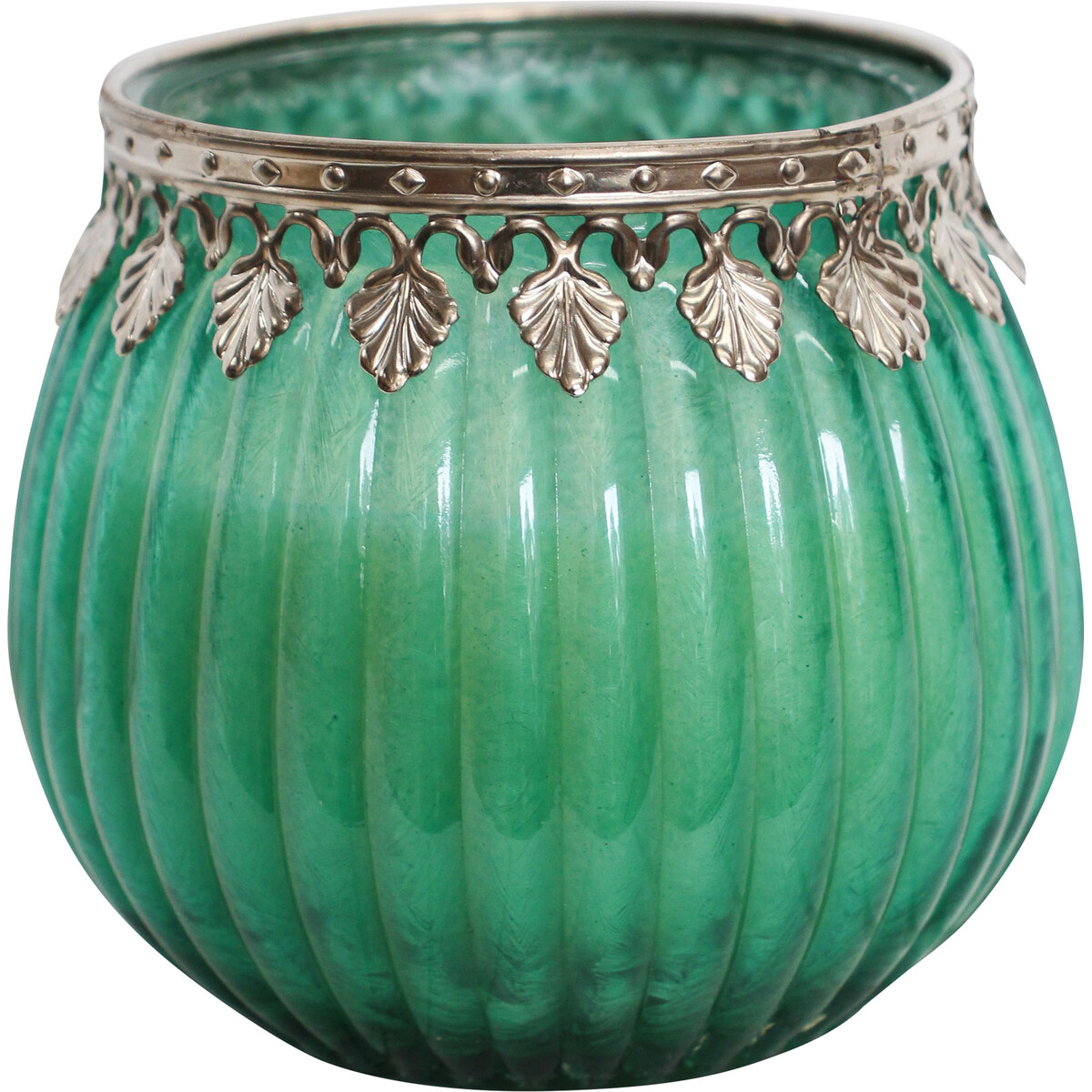 This votive has been given a gorgeous artisanal finish crafted from high quality dense glass, its however clear enough for the light to find its way out of the walls of the votive. The 10 cm ribbed green body of the votive has this gorgeous cloudy green colour-the rim in silver coordinating with it ever so delightfully. Striking on its own and even more a stunner when in the company of other votives and candle holders that can help make your lighting and illumination acquire a whole new personality. The glass is toughened and will easily bear the brunt of heat. Its mouth is wide enough to allow an easy clean up when wax residues need to be removed. Possesses a wonderful mid-eastern kind of appeal.