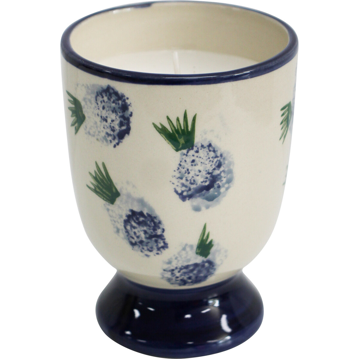 Did you know that the pineapple plant is originally native to South America? Despite this, this incredibly sweet fruit is being planted all across the world where it can survive. Our country is not left out as it is a popular fruit which is too sweet for us to miss out on! It is this same much loved fruit that inspired the abstract looking hand painted pineapple motif which beautifully decorates this candle. Apart from the obvious beauty of this candle holder, contained in it is vanilla scented wax with a long burning wick.