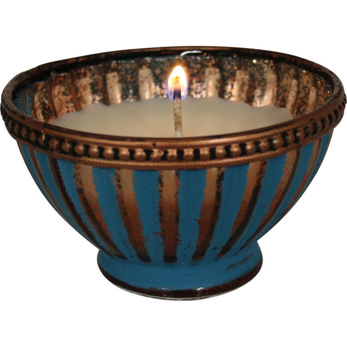 Made from sturdy quality glass, this blue coloured votive is all of 6 mc in height and about 10 cm in diameter it has ribbing on its body that is doused in blue colour with touch of rust that defines its design all the more. Filled with wax-it will send a steady glow of warm light al across. Once the original wax filling is consumed, you could place a tealight and it shall continue to render its services like any other regular votive the wide-open top narrows down to a small little round base on which this little lamp sits. The top is rimmed in a metal ring adding to its charming eastern looks add more such votives to give your interiors a different flavour of mood. Could be placed on table tops shelves, on your dinner table or the bedside-there are so many occasions and so many great reasons to want this votive!