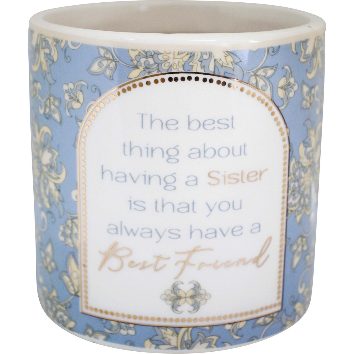 It's no secret that sisters often make the best friends. Our Candle Sister is a lovely sentimental gift for any sibling, especially those who want to show their appreciation. The candle comes in a blue patterned ceramic container with a golden rim and has a vanilla wax centre and it measures 9.5cm x 9.5cm.