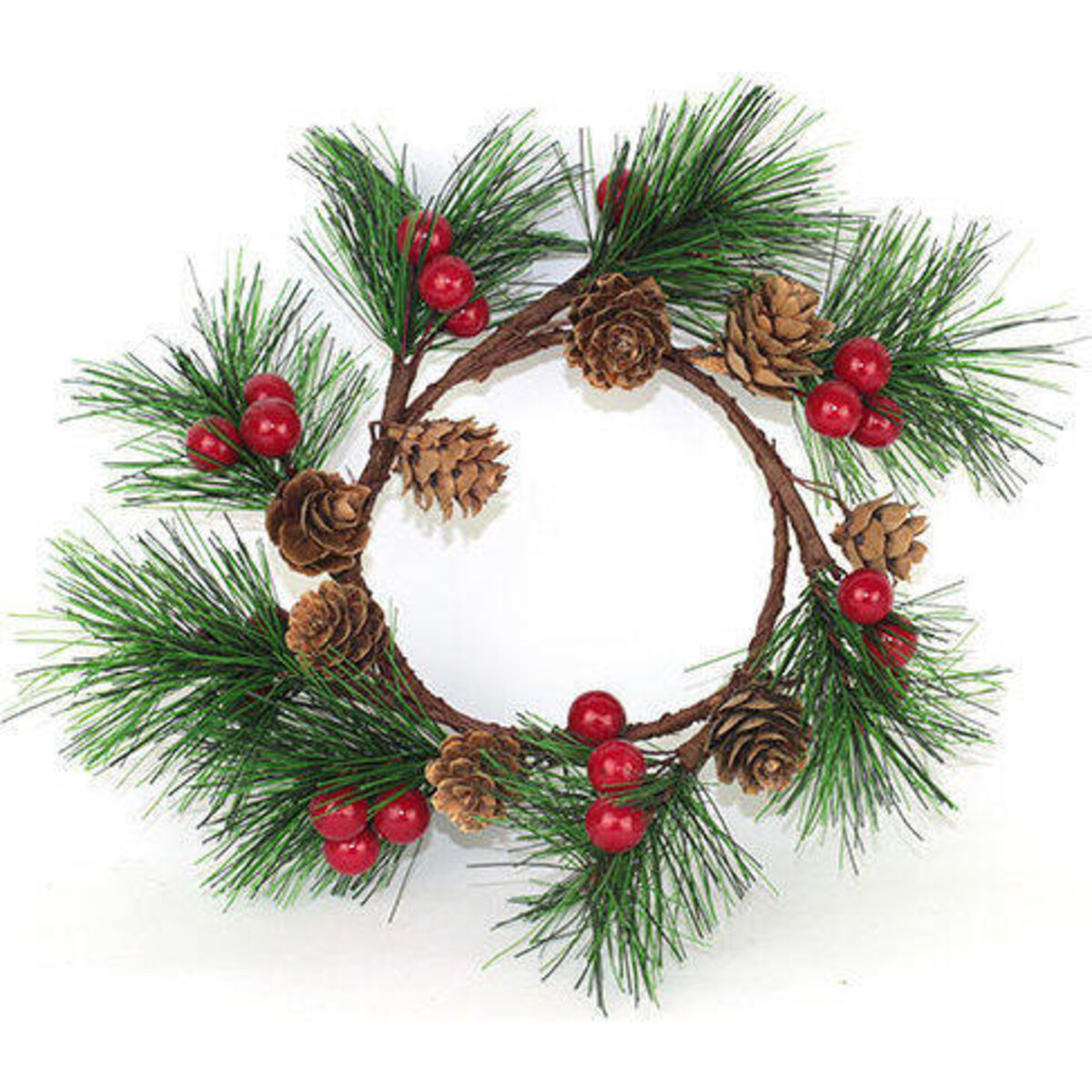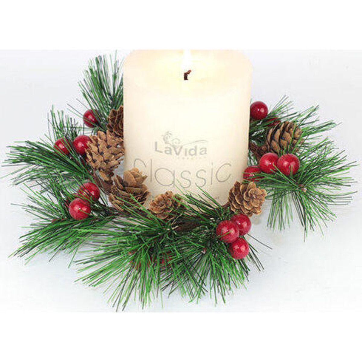 Place a pillar candle in its bosom and let the wreath do the rest. Here is a wonderful means to combine two stellar articles that always make your décor look wonderfully Christmassy - candles and wreaths and when you place a candle in the wreath itself, the effect is stunning. Made with an eye on details - the fruits, foliage and the flowers complement each other perfectly. The soft wires allow you to adjust the curvature while the green tiny needle like spruce leaves looks simply wonderful enigmatic in their presence. The pine cones and the red berries contrast vividly. The wreath is all of 25 cm in diameter and would sit snugly around a large pillar candle. Could be placed as your centrepiece or if you are doing up a corner you could create such snug fit smaller candles in wreaths for a larger kind if display. In all, the very contrast of white pillar candles with a green wreath is refreshingly tuned to the season of joy and should be your best bet at making your décor look great.