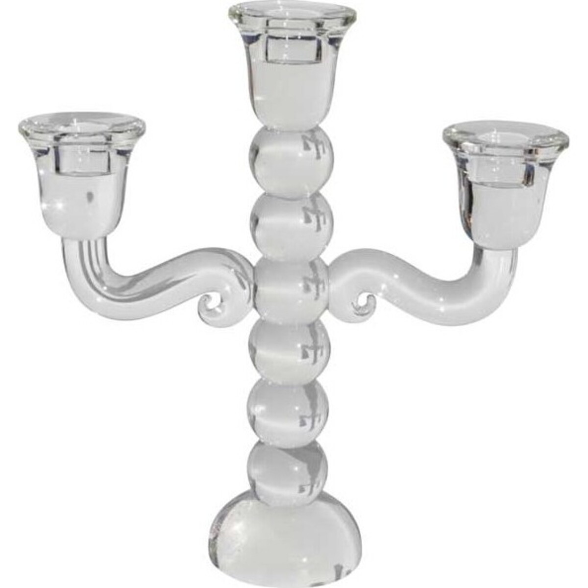 Two handles accommodating the holders are intricately hewn at the sides of this triple-holder accessory in clear and transparent motif. All three candle holders are designed with the deep central cut for the candles to stay in place.