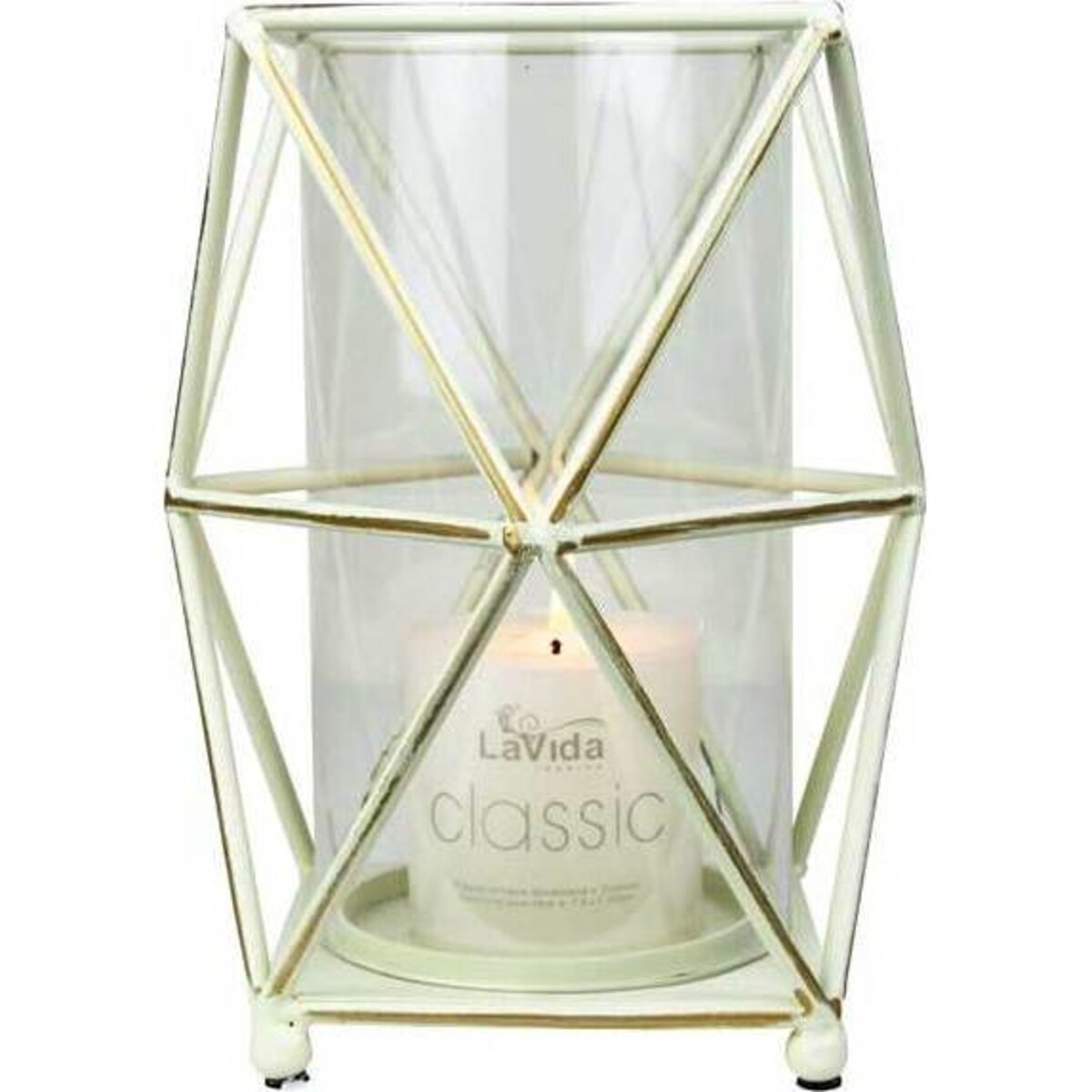 Along the lines of the fascinating metal craftsmanship of the entire Goldline range is this gorgeously designed and elegant candleholder that will not only help in throwing delicate lighting on to corners but will on its own add so much charisma to the decor. While decorating interiors one always wishes to downplay certain places and highlight more those that help develop a theme in the decor - with this candleholder this become all the more easier. The Goldline large metal candleholder is about 25 cm tall and has this angular gold grid all around with chipped white paint peeling off in places. A large candle can be placed inside it where it can rest on a flat base. The glass within which it is placed will allow a clear reflection of light and the holder itself comes with four small little legs that will give the candleholder great stability. The large size is most conducive for corners that need some lighting or highlighting.