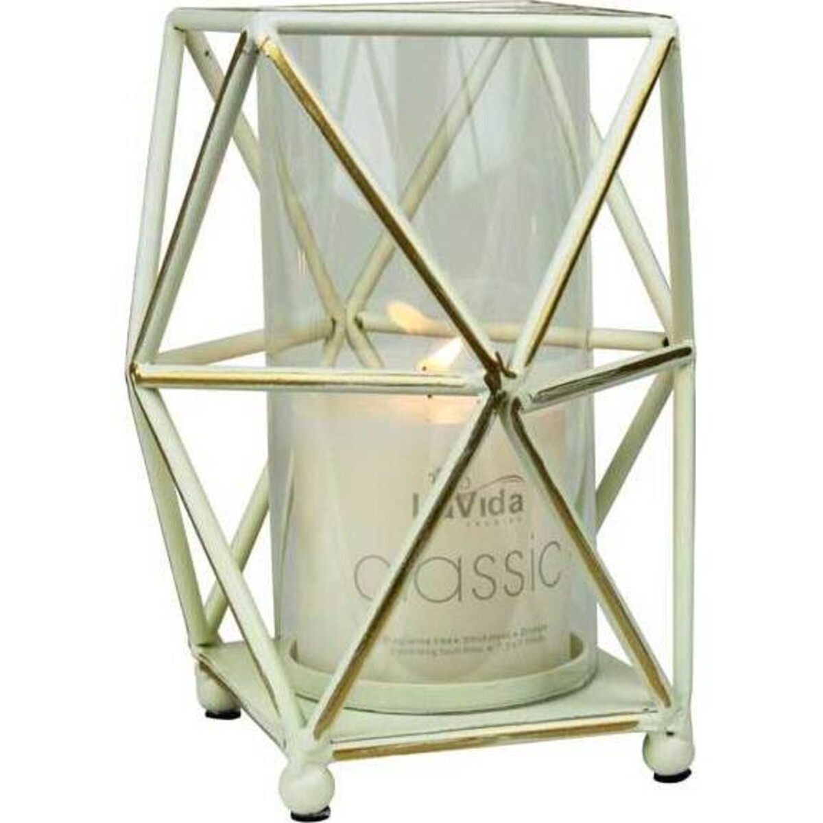 This small Goldline candleholder looks fabulous as its gold and white paint makes quite an elegant statement, as does the unique metal frame design that looks classic yet modern. The candleholder has a round base where a candle can find space and the glass patterned outer frame will look positively dramatic when all lit up from the inside. A must have for those interiors which end small doses of elegant style that can make difference to the interior. The placement of the candle and cleaning of the wax will be easy as the frame can be removed and replaced easily. The frame will not lose shape and the glass is of high quality. It creates an utterly dramatic effect with glass and metal that speaks volumes of Lavida's constant endeavour to supply artistic embellishments for homes and interiors.