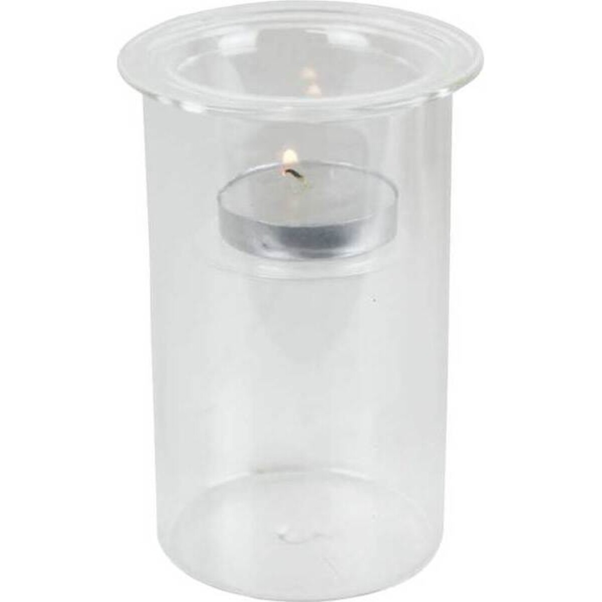 A small tea light candle appears to be suspended in mid - air in the Candleholder Hanging Cylinder from LaVida. Inside this wide - mouthed cylindrical glass candle holder is another, smaller glass insert with a funnel - like appearance. This portion holds a small tea light and creates the illusion that the candle is floating. This candle holder captures the eye - and the imagination - when on display on a tabletop of mantle. It can easily stand alone but would look quite striking in groups, such as lined up along the buffet table of a dinner party and displayed across a fireplace mantle or even a hearth.