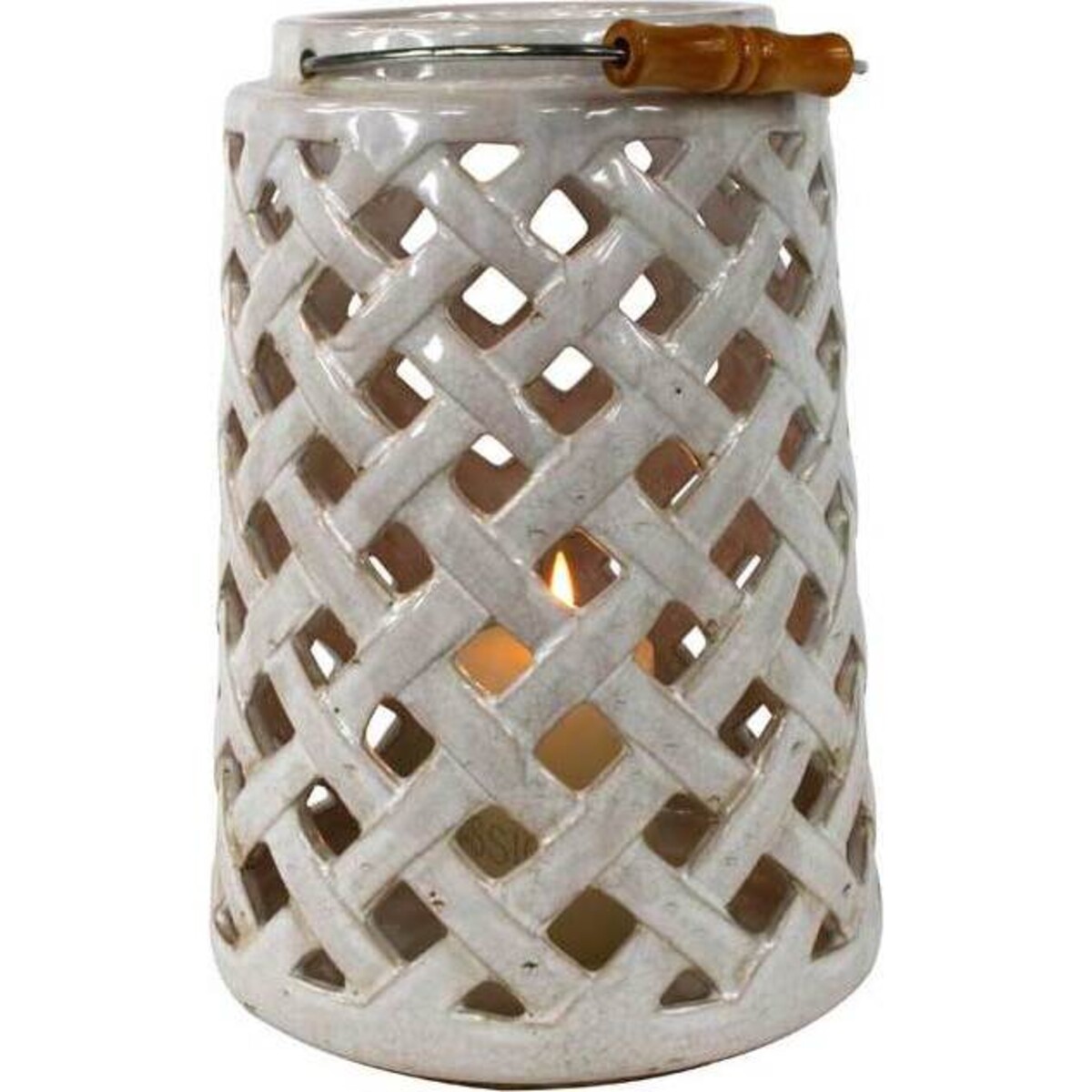 Incorporate some of the outdoors into your home with these large Lattice Candleholders. They have the same lattice fence design that you adore, but in a compact cylindrical shape that encompasses a single candle inside. Each white candleholder is dusted with a bit of brown colouring to give it a charming weathered and worn appearance. Its woven configuration lets the flame shine through allowing you to use this item for style as well as function. Thanks to their wooden handles, you'll be able to carry them from room to room and place them wherever you need a little extra dose of light.