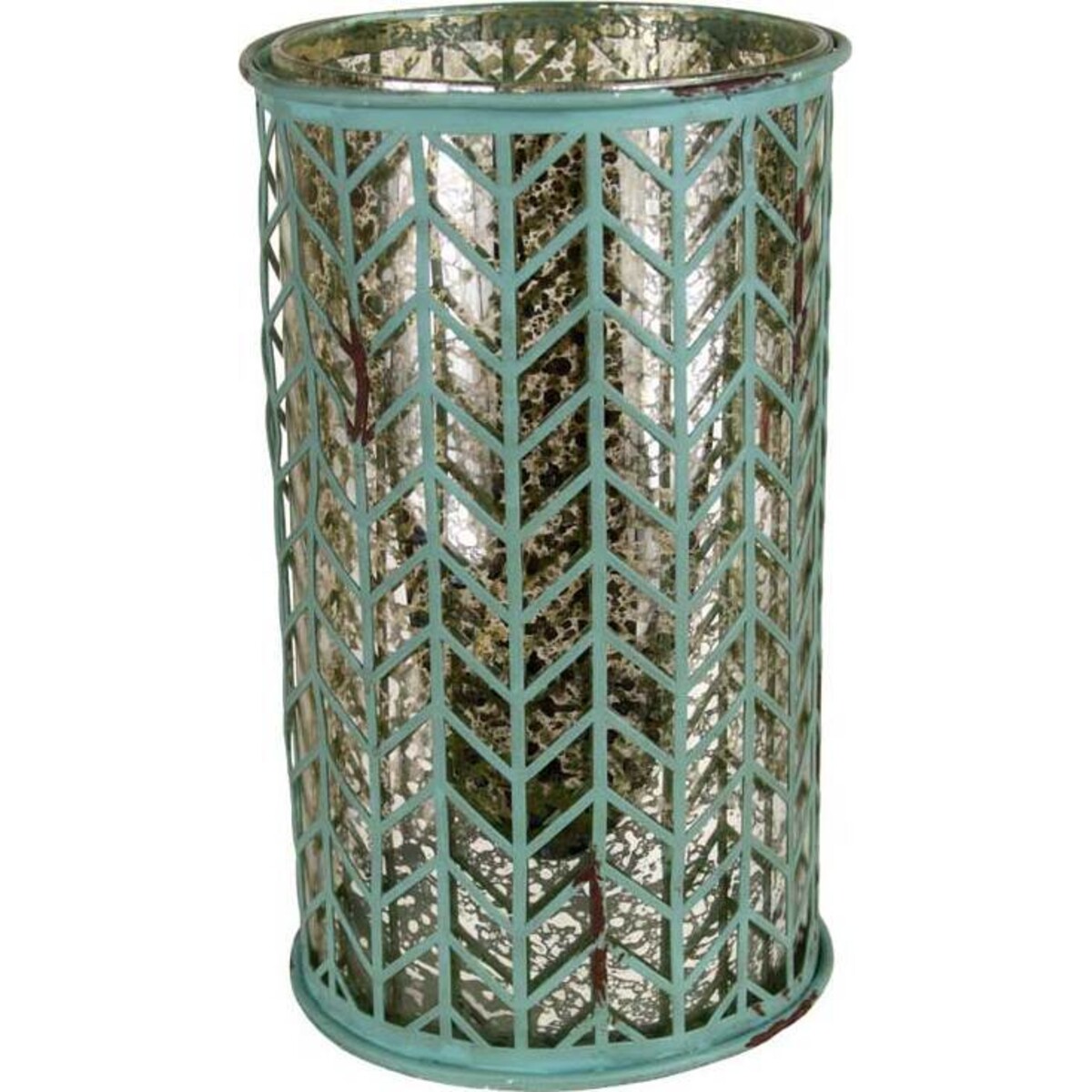 The Mercury Chevron candleholder is simply one of the bets crafted in this niche and the wonderful confluence of artistry of glass and metal comes together wonderfully. Almost 18 cm tall and 11 cm in diameter this round based candleholder can of course hold a largish round candle that will work great to highlight parts of the decor where it is going to be placed. The outer casing is made of the typical zig zag of the classic chevron pattern that looks both vintage and quite antiquated. The rubbed paint that is peeling on in places adds on to that look. The speckled glass is silvery which looks all the more dramatic when the candle within lights up as it throws the light off in the most spectacular of manners. Placed alongside coloured galls ware or other antique piece s it will look positively enchanting and will create just the theme decor highlight as it should. The glass will be able to with stand the heat and the metal casing will not get over heated as there are two layers of material between the flame and the hand.