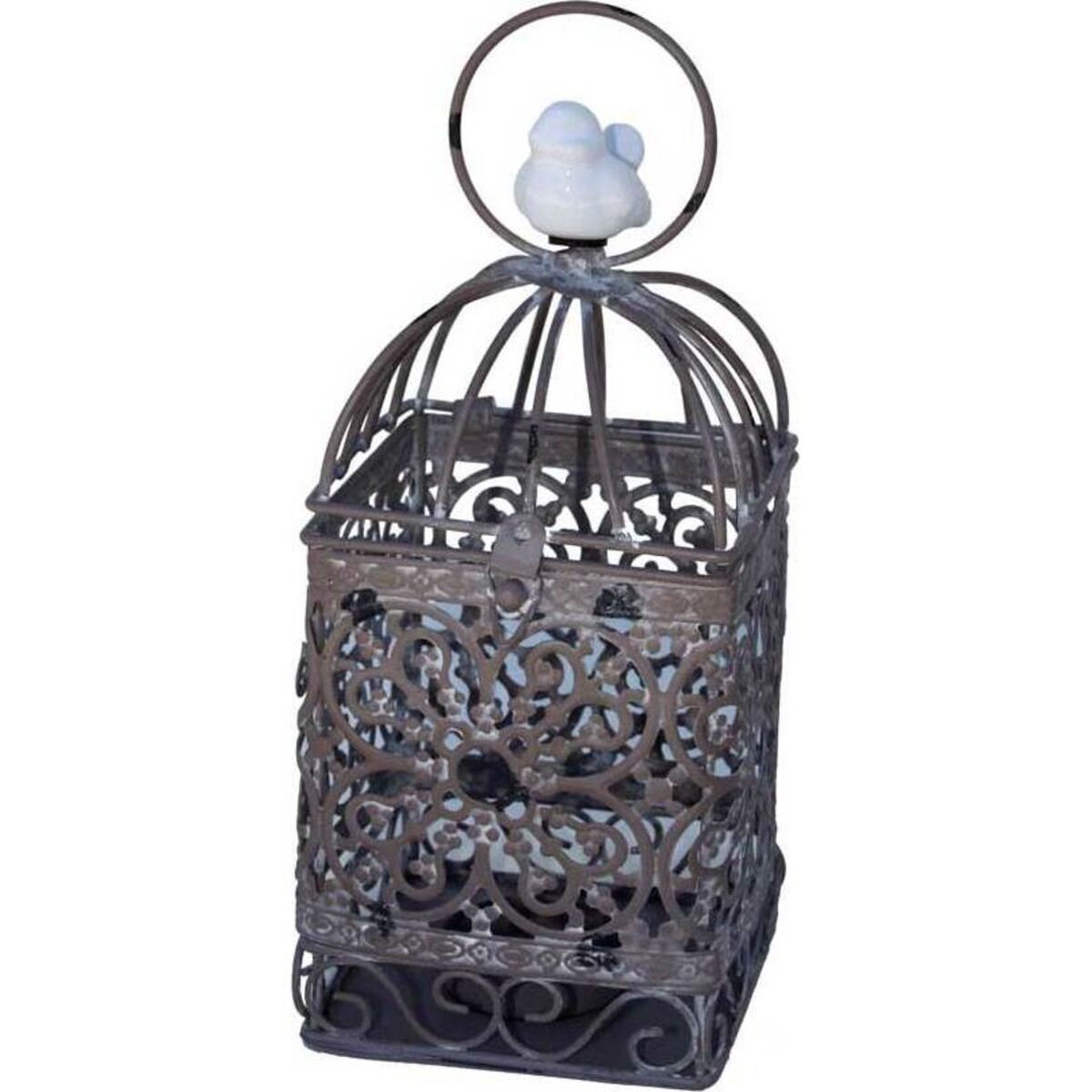 The short brown metal candleholders feature an elegant scroll design that's accented with touches of white to give it a weathered and aged appearance. At the top sits a sweet little white bird in the center of a ring, which not only doubles as a finishing touch, but also as a handle from which you can easily transport or hang the candleholder. While almost any style of candle will do, pillar and tealight candles would be best and will shine beautifully through the filigree.