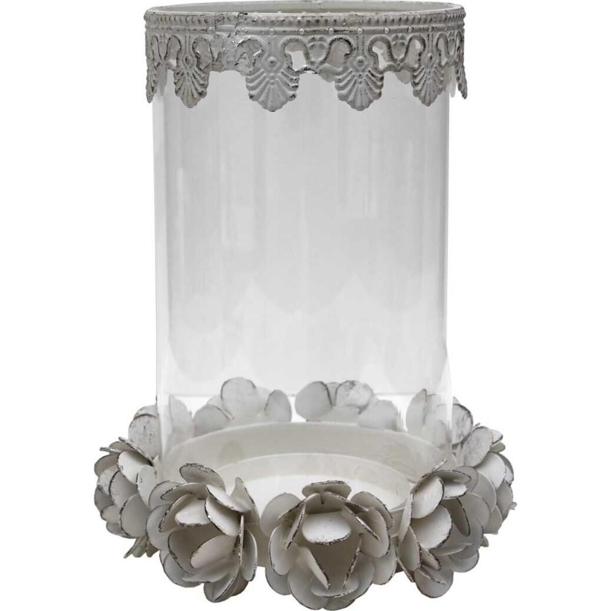 A gorgeous arrangement of large white-and-silver-speckled roses wraps around the base of the cylindrical shaped glass candle holders. An intricate white-and-silver design surrounds the top edges and makes the pieces stand out above all the others. A slightly weathered look on the details transforms the candle holders from ordinary to extraordinary. Large silver or white pillar candles would complement the decorative pieces beautifully. The candle holders are stunning enough to draw attention regardless of where they're placed but would especially stand out in foyers and on coffee tables, counters or end tables. Although they're gorgeous as is, they're even more-so when the light shines through. They're ideal for any nature or flower fan and make excellent gifts. Candles are not included with purchase.