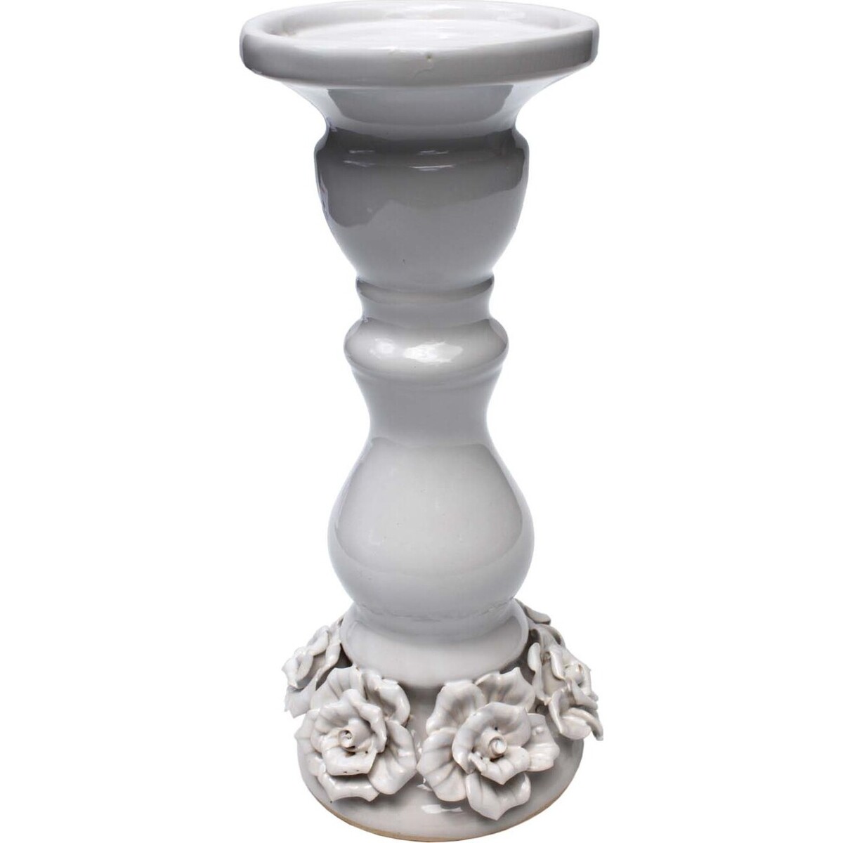 The all-white candleholder would stand out when paired with a brightly hued candle or look crisp when paired with a similarly coloured white candle. There have to be at least two matching candlesticks resting on top of any traditionally set dining arrangement, even if you do not need them in order to see. Placing them beside a full bouquet of white roses would create an attractive centerpiece for a dining or side table. The fluted candlestick is well proportion and rests on a base ringed with three dimensional roses of white porcelain. The combination of a candle holder and the ring of white porcelain roses looks shabby chic amid the modern and antique. One can almost picture them resting atop café tables in a garden setting underneath a row of twinkling lights.