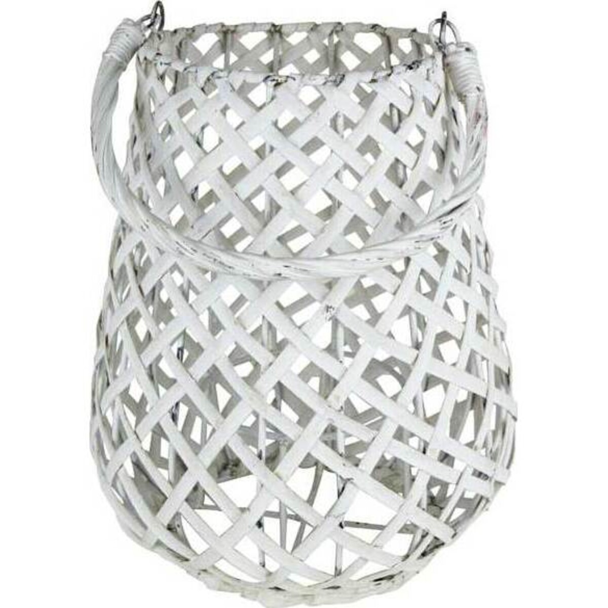 A great way to bring alive the romance of natural lighting is this gorgeously designed wicker and metal candle stand that has been cleverly created from metal frame around which wicker has been wrapped in a woven pattern. The candle light flickers its glow around creating interesting shadows and assumes a character as if from the past. The candleholder comes with a handle that like any other lantern simply sits on the side till one needs to lift up the candle holder. The larger size in this design is as high a s 30 cm and as broad as 16 cm around its base where it kind of bulges out in a pretty curve. A great way to light up the outdoors when special occasions make one take the party beyond the ordinary locations. The wicker has been washed in white giving the holder a further look of farm and country - a rustic beauty that gets enhanced even more with candle glowing inside. Structurally firm as the entire frame is made of metal - this is one sturdy piece that will see one though many occasions.