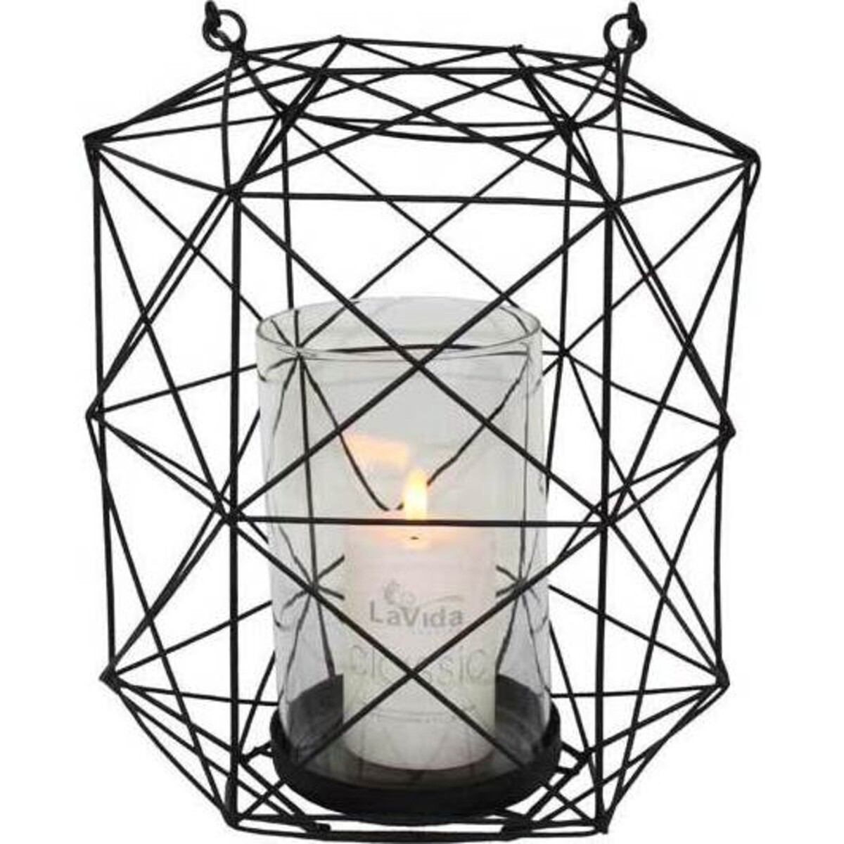 The Candleholder Wire Geo Straight is a six point geometric hexagon wire cage. It holds votive and candles in the centre part where there is a glass votive holder that can fit any normal sized candle, votive or tea light. There is a decorative moving handle at the top of this candle holder that gives it a nice extra detailed touch. The handle is purely for decoration and must not be used when there is a candle burning on the inside of the cage. The intricate looking wire frame is made from black metal wire. It is made with quality materials and is sturdy and able to be used inside or outside in most elements.