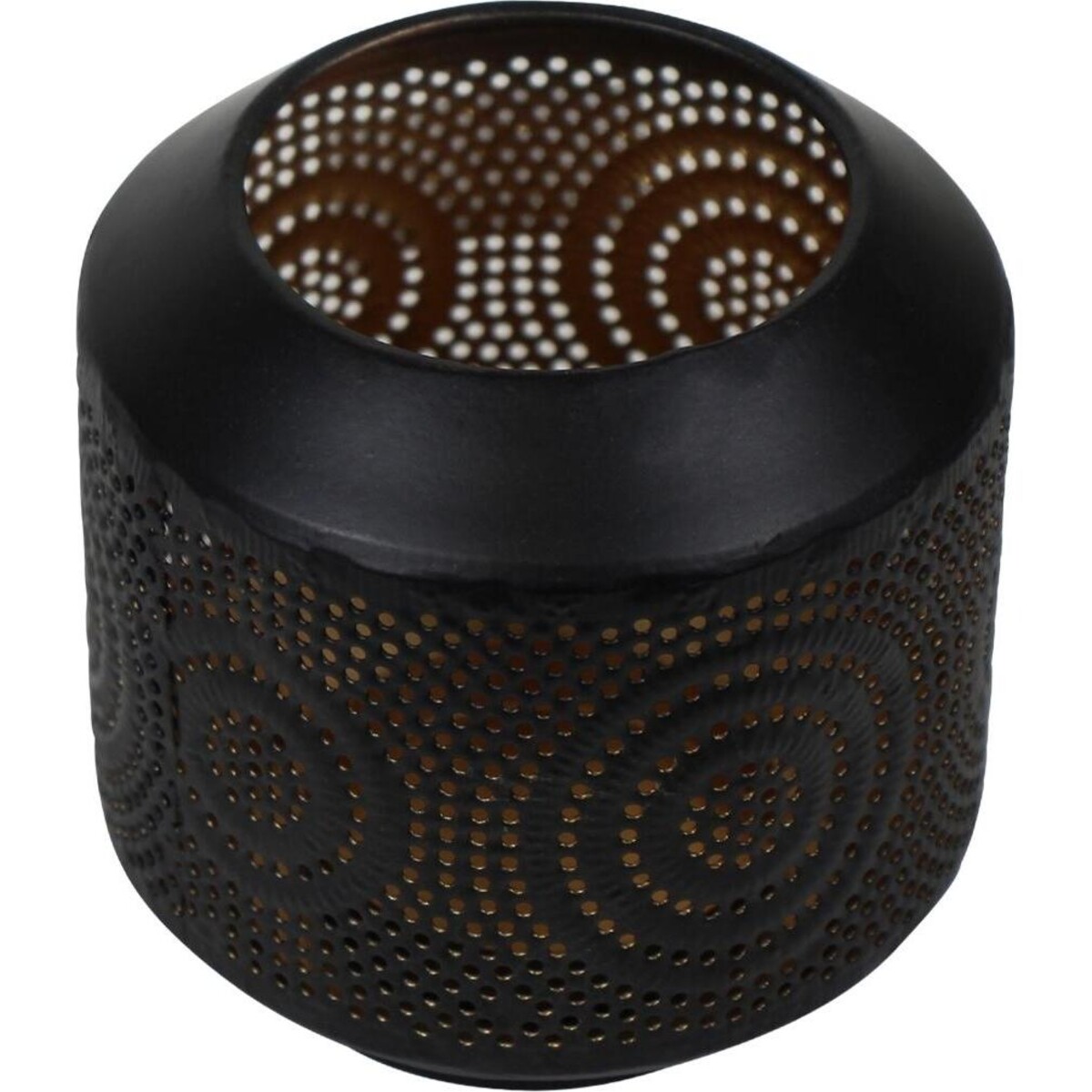 Revel in the joy of thousands of rays of light falling all around the candle holder. It is merely 10 cm tall with a cylindrical body that can hold a tiny pillar candle within. Add it to any table, corner or mantle and see how dramatically the effect of the lighting will change the mood and impact the room or the space. The burnished metal inside it glows in dull golden glow while the golden rays of light fall in the same pattern that can be seen all across its perforated body. As beautiful unlit as it is with a glowing candle inside.