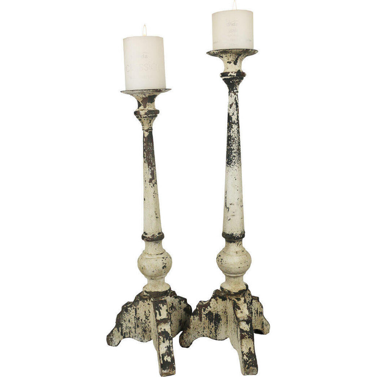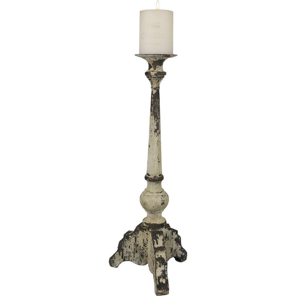 Add the romance of candle light to your home by placing the pillar candle on candle stand that looks antique and shabby at the same time. Here is some that has been crafted carefully to create the look of age - with its peeling and weathered look. The stand is about 53 cm tall making it quite tall and thus easily used placed on the floor. If placed on the console or the corner table wit will look really high and help light up a larger area. The metal stand has a wide leg design that almost resembles a tripod. The stem rises handsomely and has very little design accent yet does host a delicate design that looks classy and not overly ornate. The white paint and the signs of rusting all add to its looks. Th width of its legs is around 20 cm and thus it balances well. The candle could be placed on the round platform created on top. Pillar candles in large sizes could be placed on the base and it would give you many hours of radiance.