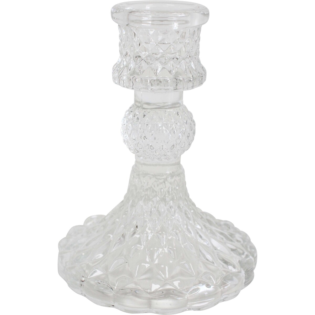 The Candlestick Sml Clear boasts an intricate design, with patterns that catch and reflect light, adding a touch of sophistication and elegance to both home and office settings. Its compact size makes it a perfect accent for cozy dinners, a peaceful bath, or a desktop companion—anywhere you desire a soft, inviting glow.