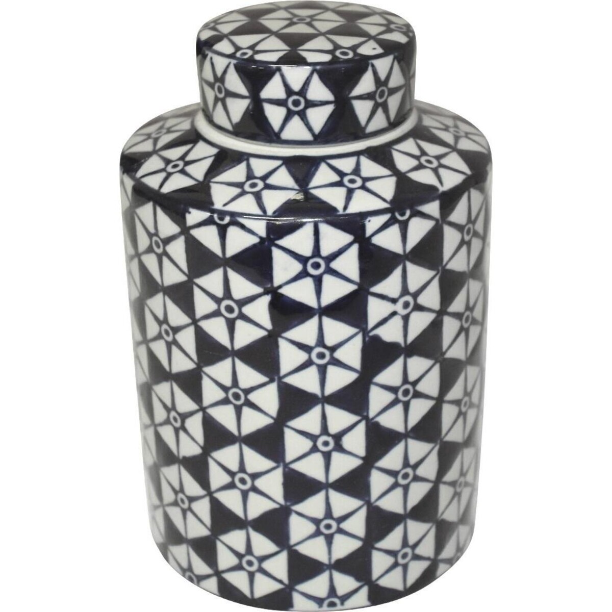 It is cylindrical in shape and comes with a top that easy to lift and open. The black - and - white pattern on it makes it look rather chic. The height of the canister is 19 cm and hexagonal pattern on it gives that gives it a vivid and attractive presence. The small round body and the cap like top are some of its features that makes it all the more desirable. You can place it on the kitchen counter or on the sideboard and use it for storage or simply for display. Take the lid off, fill up some water and you can also use it just like any other flowers vase. You will find its design most appealing because it breaks the monotony of the space with its geometric pattern. Expert hands have created this piece for the discerning buyers who come back to Lavida for more such extraordinary pieces. Functionally a great place to store and in terms of decor, a whole new look will be added. You can make a set of use it in singles.